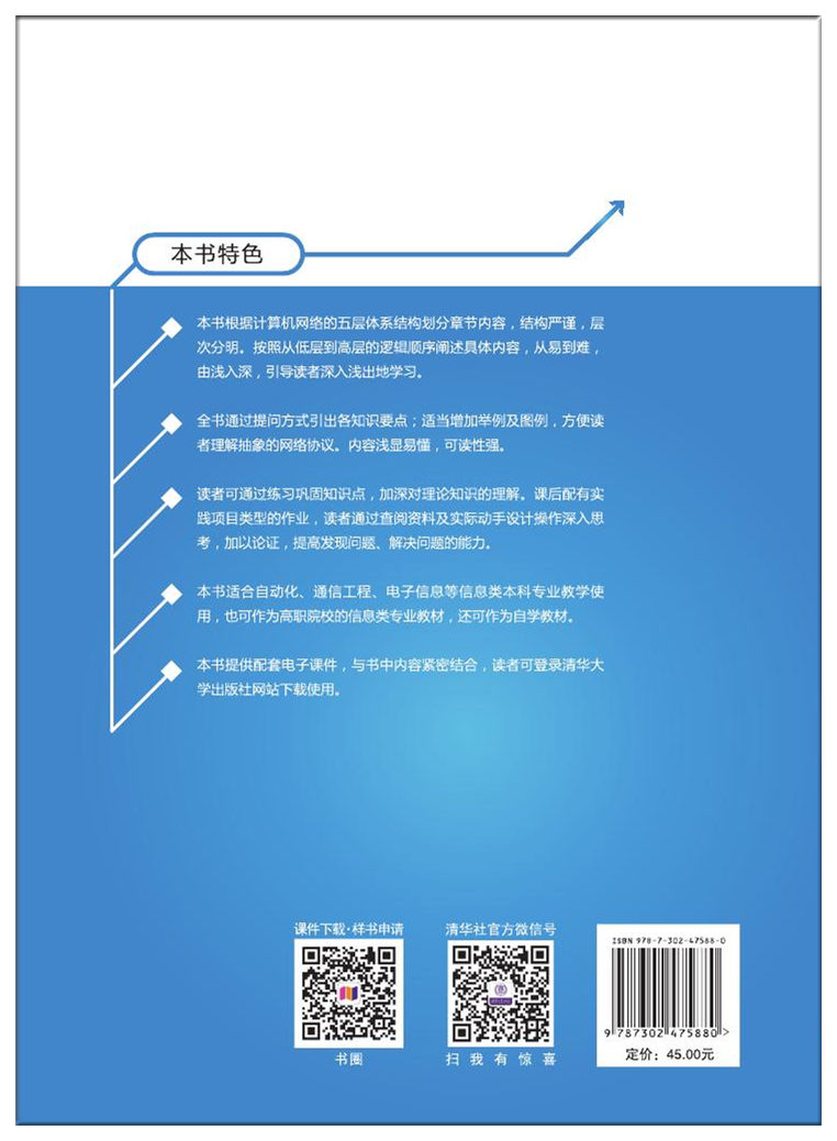 按照从低层到高层的逻辑顺序阐述具体内容,引导读者深入浅出地学习。通过提问方式引出各知识要点;增加举例及图例,方便学生理解抽象的网络协议。内容浅显易懂,可读性强。读者可通过练习巩固知识点加深对理论知识的理解。课后有实践项目类型的作业,读者通过查阅资料及实际动手设计操作拓宽思路,深入思考,并加以论证,提高发现问题、解决问题的能力,变被动接受为主动学习。适用于自动化、通信、电子专业等信息类本科专业使用,也可作为高职院校的信息类专业教材,还可作为自学教材。