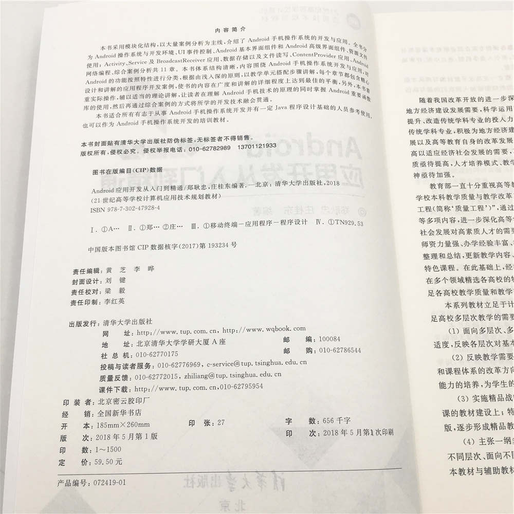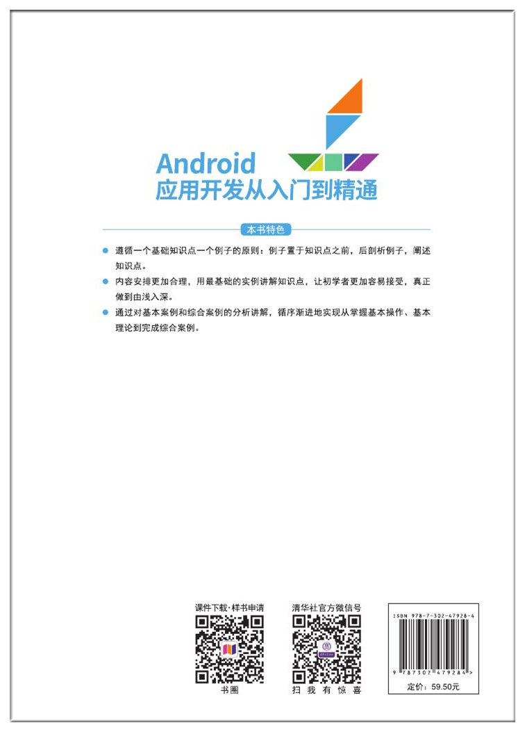 前言 目前Android是一门新兴技术,无论是相关书籍还是教育体制都处于初级阶段,因此Android人才在短期之内将会呈现供不应求的状态。从长期来看,随着各种移动应用需求的增加,手机应用开发商对Android应用的开发力度也会不断加大,因此,随着安卓手机用户比例的增长,更加剧了市场对有关Android系统开发书籍的需求。 本书对Android的功能按照特性进行分类,根据由浅入深的原则,以教学单元搭配步骤讲解,每个章节都包含精心设计和讲解的应用程序开发案例,使书的内容在广度和深度上达到最佳的平衡。另外,本书着重实际操作,并辅以适当的理论讲解,让读者在理解Android手机技术的原理的同时掌握Android重要函数库的使用,然后再通过综合案例的方式将所学的开发技术融会贯通。 相对其他教材,本书具有如下特点: (1) 遵循一个基础知识点对应一个实例的原则: 将实例置于知识点之前,然后剖析实例,阐述知识点。 (2) 内容安排更加合理,用最基础的实例讲解知识点,让初学者更加容易接受,真正做到由浅入深。 (3) 通过对基本案例和综合案例循序渐进的介绍分析,由浅入深地完成掌握基本操作、基本理论到完成综合案例的全部过程。 本书可作为本科或高职高专软件工程、计算机科学与技术等专业的教材,也可供其他专业学生和从事Android开发与应用的有关技术人员参考。课程标准学时为72学时或54学时,在教学过程中可根据具体情况选学本书内容。 本书由郑耿忠主编和统稿,其中第1~6章由郑耿忠编写,第7~11章由庄桂东编写,书中案例由庄桂东录制。 本书在编写和出版过程中,得到...
