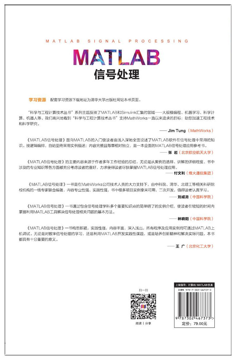 前言 数字信号处理是从20世纪60年代以来,随着信息学科和计算机学科的高速发展而迅速发展起来的一门新兴学科,它的重要性日益在各个领域的应用中表现出来。简言之,数字信号处理是把信号用数字或符号表示的序列,通过计算机或信号处理设备,用数字的数值计算方法处理,以达到提取有用信息、便于应用的目的。 MATLAB 是一个功能强大的数学软件,用于算法开发、数据可视化、数据分析以及数值计算的高级技术计算语言和交互式环境,为科学研究、工程设计以及必须进行有效数值计算的众多科学领域提供了一种全面的解决方案。 目前,MATLAB已成为信号处理、图像处理、通信原理、自动控制等专业的重要基础课程的首选实验平台,而对于学生而言最有效的学习途径是结合某一专业课程的学习掌握该软件的使用与编程。 1. 本书特点 由浅入深,循序渐进: 本书以初中级读者为对象,内容安排上考虑到MATLAB进行仿真和运算分析时的基础知识和实践操作,从基础开始,由浅入深地帮助读者掌握MATLAB的分析方法。 步骤详尽,内容新颖: 本书结合作者多年MATLAB使用经验与实际应用案例,将MATLAB软件的使用方法与技巧详细地讲解给读者,使读者在阅读时能够快速掌握书中所讲内容。 实例典型,轻松易学: 学习实际工程应用案例的具体操作是掌握MATLAB最好的方式。本书通过综合应用案例,透彻详尽地讲解了MATLAB在各方面的应用。 2. 本书内容 本书结合多年MATLAB使用经验与实际工程应用案例,将MATLAB软件的使用方法与技巧详细地讲解给读者。本书在讲解过程中步骤详尽、内容新颖,讲解过程辅以相应的图片,使...