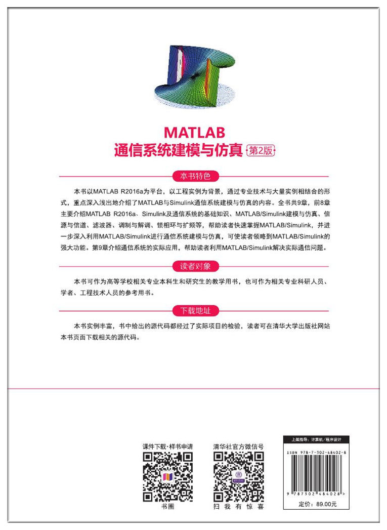 《MATLAB通信系统建模与仿真(第2版)》是“精通MATLAB”丛书之一,以MATLAB R2016a为平台编写,归纳和总结了MATLAB与Simulink通信系统建模与仿真的原理、应用与实践,应用性强,实用价值高。《MATLAB通信系统建模与仿真(第2版)》提供所有程序源代码。“精通MATLAB”相关书目如下:(1)MATLAB 8.X实战指南(2)数字图像处理高级应用——基于MATLAB和CUDA的实现(第2版)(3)MATLAB R2015a数字图像处理(4)MATLAB R2015b数学建模(5)MATLAB R2015a小波分析(6)MATLAB R2015b神经网络技术(7)MATLAB R2015b最优化计算(8)MATLAB R2015b概率与数理统计(9)MATLAB R2015b数值计算方法(10)MATLAB R2016a智能计算25个案例分析(11)MATLAB R2016a在电子信息工程中仿真案例分析(12)MATLAB R2016a神经网络设计与应用28个案例分析(13)MATLAB R2016a通信系统建模与仿真28个案例分析(14)MATLAB通信系统建模与仿真(第2版)