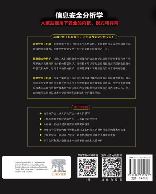 信息安全分析学 的作者们分享了丰富的分析技术经验并通过案例研究以演示实际操作技术。 展示如何运用免费提供的工具并结合不相干的数据集来查找异常和异常值,传授有关威胁模拟技术以及如何将分析技术用作评估组织内安全控制和流程要求的强大决策工具,学习如何使用这些模拟技术来帮助预测和剖析组织中的潜在风险。