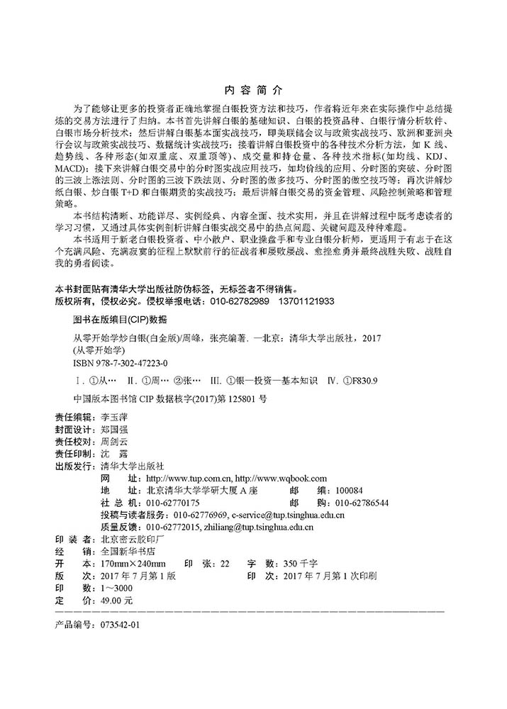 为了能够让更多的投资者正确地掌握白银投资方法和技巧,作者将近年来在实际操作中总结提炼的交易方法进行了归纳。本书首先讲解白银的基础知识、白银的投资品种、白银行情分析软件、白银市场分析技术;然后讲解白银基本面实战技巧,即美联储会议与政策实战技巧、欧洲和亚洲央行会议与政策实战技巧、数据统计实战技巧;接着讲解白银投资中的各种技术分析方法,如K线、趋势线、各种形态(如双重底、双重顶等)、成交量和持仓量、各种技术指标(如均线、KDJ、MACD);接下来讲解白银交易中的分时图实战应用技巧,如均价线的应用、分时图的突破、分时图的三波上涨法则、分时图的三波下跌法则、分时图的做多技巧、分时图的做空技巧等;再次讲解炒纸白银、炒白银T+D和白银期货的实战技巧;最后讲解白银交易的资金管理、风险控制策略和管理策略。 本书结构清晰、功能详尽、实例经典、内容全面、技术实用,并且在讲解过程中既考虑读者的学习习惯,又通过具体实例剖析讲解白银实战交易中的热点问题、关键问题及种种难题。 本书适用于新老白银投资者、中小散户、职业操盘手和专业白银分析师,更适用于有志于在这个充满风险、充满寂寞的征程上默默前行的征战者和屡败屡战、愈挫愈勇并最终战胜失败、战胜自我的勇者阅读。