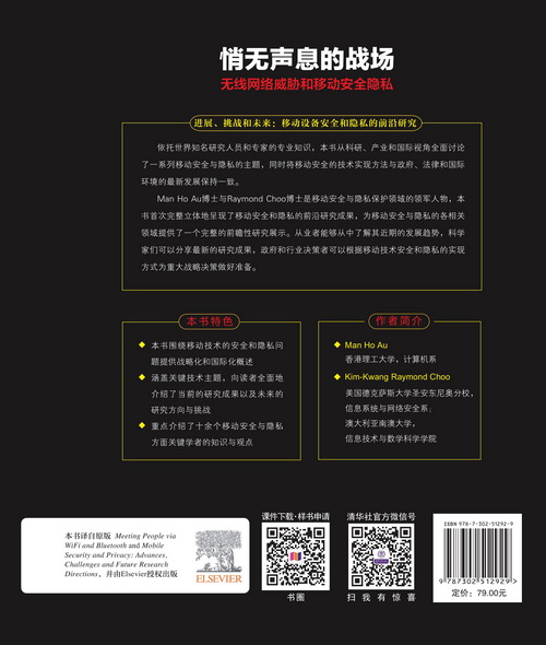 电子技术的发展,使得手机日益成为人类社会必不可少的一部分。手机极大的便利了生活,尤其是智能手机,它帮助我们全天候地保持在线状态,它记录我们的行动轨迹,它保存着我们的影音图像,它忠实地把我们的生活记录在小小的设备中。利用合法或非法的手段我们就可以通过它了解手机主人的社交网络、行动轨迹、情感历史,甚至可以推测其性格特点。用一句话来概括,智能手机可以保存其使用者的几乎全部信息特征。 电子技术与数字化时代的飞速发展使得信息产生速度和容量呈几何倍数地增长,而此前附着于信息载体上的安全的重要性被信息自身安全的重要性取而代之。信息的安全性就像达摩克利斯之剑一样悬在每个人的头顶,在我们感叹信息技术伟大的同时却处处受到它的掣肘,稍有不慎,便可能遭遇其带来的意想不到的麻烦。2016年,全球已约有3000起公开的数据泄露事件,22亿条记录被泄露或者盗取[1];2017年全年超过50亿条信息被泄露或者盗取。自2015年10月以来在黑客的暗网里贩售的网易、腾讯、新浪、搜狐账户总数达18亿之多。 每个人都应学会如何保护个人信息的安全,就如同人人都需要保护自己人身安全一样重要。保护自己人身安全需要强化安全意识和身体体魄,个人信息的安全也是需要知识的积累和必要的投入。《悄无声息的战场——无线网络威胁和移动安全隐私》详尽分析了大量用户的典型行为,以及与之相伴的安全和隐私风险,并提供了一系列的安全建议供用户参考。《悄无声息的战场——无线网络威胁和移动安全隐私》通过系统化地讲解了手机安全和隐私保护的概念,对比阐述传统的防护方法与基于机器学习的防护软件的优缺点,向用户介绍了如何保护个人的信息以减少隐私泄露和财产损失的风险。 这是一场涉及所有人的、旷日持久的战役,知己知彼方能百战不殆。为了保护个人隐私和数据安全,我们应将信息安全列为基础教育的必修课,同时政府机构需完善其信息安全法律法规加强对个人数据的保护,个体尤其要养成良好的隐私保护习惯,当然还需要企业制作更加精良强大的工具以保护个人信息安全。 《悄无声息的战场——无线网络威胁和移动安全隐私》依托世界知名研究人员和专家的专业知识,从科研、产业和国际视角全面讨论了一系列移动安全与隐私的主题,同时将移动安全的技术实现方法与政府、法律和国际环境的最新发展保持一致。内容突出以下特色: 围绕移动技术的安全和隐私问题提供战略化和国际化概述; 涵盖关键技术主题,向读者全面地介绍了当前的研究成果以及未来的研究方向与挑战; 重点介绍了十余个移动安全与隐私方面关键学者的知识与观点; 面向广泛的读者群体,包括手机用户,手机软件设计人员和手机安全从业人员。