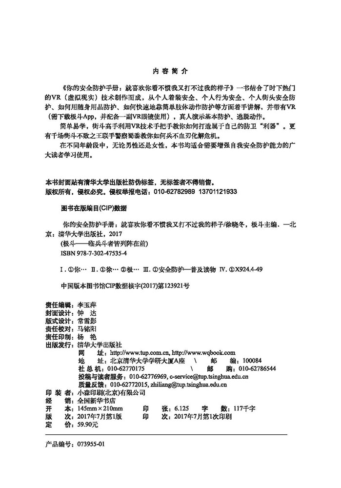 《你的安全防护手册:就喜欢你看不惯我又打不过我的样子》一书结合了时下热门的VR(虚拟现实)技术制作而成,从个人着装安全、个人行为安全、个人街头安全防护、如何用随身用品防护、如何快速地靠简单肢体动作防护等方面着手讲解,并带有VR(徐下载极斗App,并配备一副VR眼镜使用),真人演示基本防护、逃脱动作。 简单易学,街斗高手利用VR技术手把手教你如何打造属于自己的防卫“利器”。更有千场街斗不败之王联手警察蜀黍教你如何兵不血刃化解危机。 在不同年龄段中,无论男性还是女性,本书均适合需要增强自我安全防护能力的广大读者学习使用。