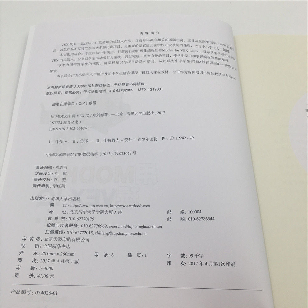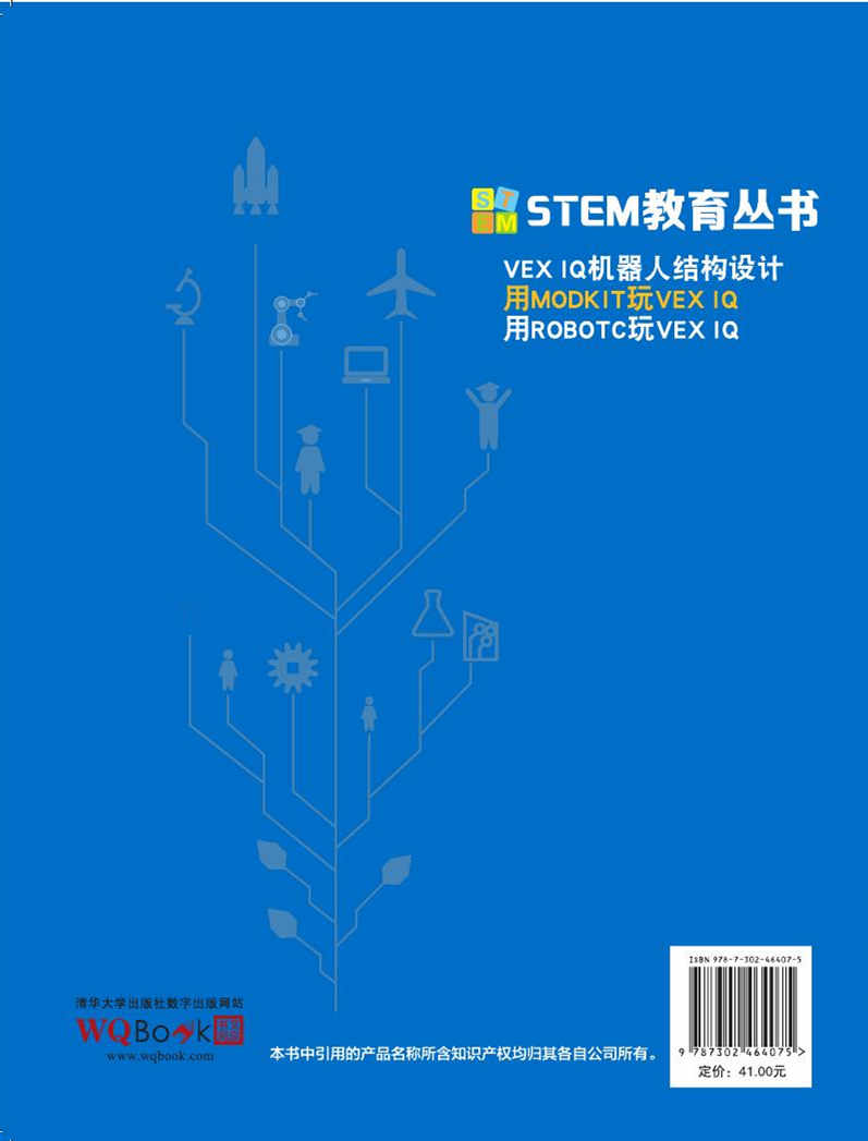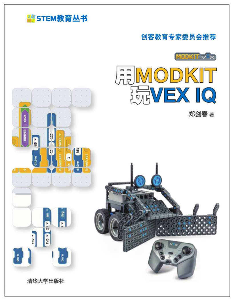 VEX IQ是一款国际上广泛使用的机器人产品,目前每年都有相关的国际比赛,正日益受到中国学生和家长的关 注,这款产品不仅可以参与众多的比赛项目,更重要的是它适合在学校开设系统的课程,适合中小学生入门使用。 本书选用适合小学生和初中生使用,目前流行的图形化编程软件Modkit for VEX-Editor,引导学生学习如何控制 VEX IQ机器人。全书以学生活动项目为主线,通过完成一系列有趣的项目,使学生学习和掌握编程的基础知识。 本书力图拓宽学生的视野,将学科知识与项目活动相结合,从而成为中小学生STEM教育课程的一种尝试与 探索。 本书适合作为小学五六年级以及初中学生创客课程、机器人课程教材,也可作为各种培训机构的教学参考用书。