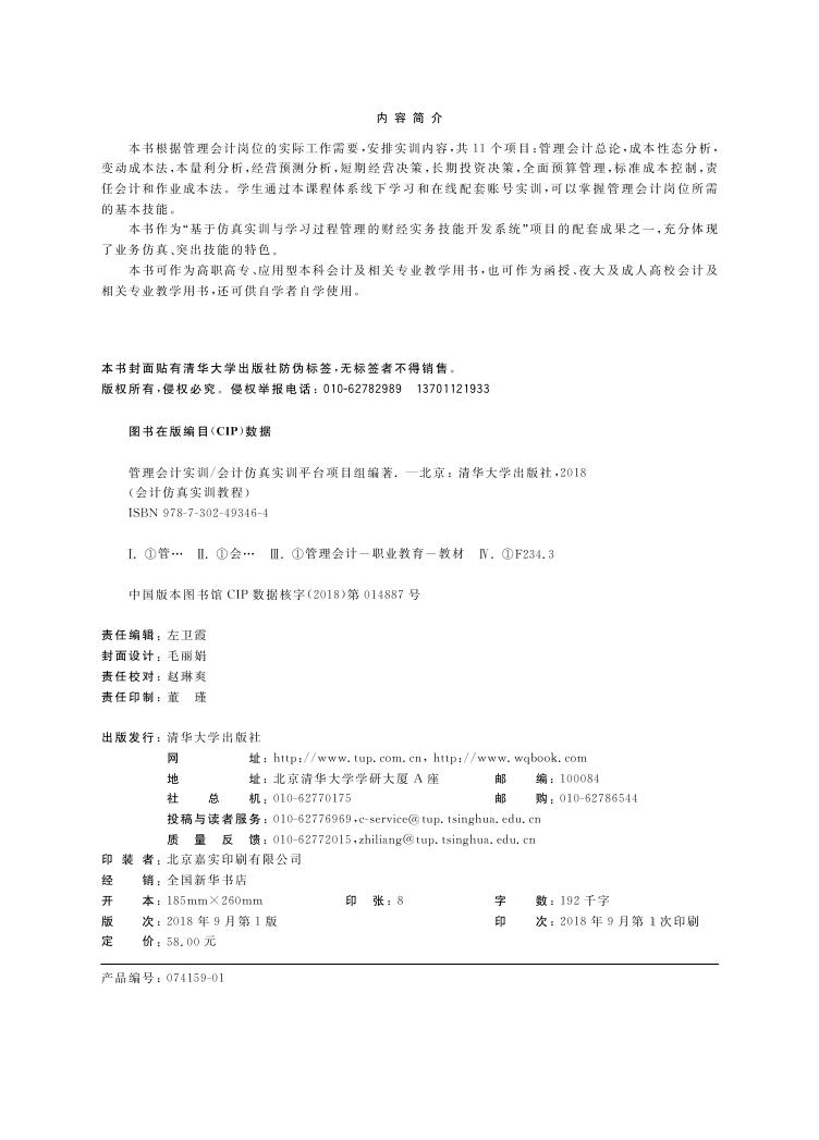 《管理会计实训》一书以企业的经济活动为例,按照管理会计岗位的要求设计实训项目和任务,素材丰富,资料翔实,实训内容具有实用性和可操作性。 本书在框架设计上遵循由浅入深、循序渐进的原则,实训内容涉及管理会计的基本方法,包括成本性态分析、变动成本法和本量利分析;涉及规划与决策会计,包括经营预测分析、短期经营决策、长期投资决策和全面预算管理;涉及控制与业绩评价会计,包括标准成本控制和责任会计;涉及作业成本法在管理会计中的应用。教师可依实际教学需求进行取舍,合理安排实训进度。 本书配有实训教学平台,按照管理会计的内在规律和企业管理会计岗位的工作流程设计实训业务,具有以下三大特点:①系统性强,体现管理会计的岗位要求;②内容全面,涵盖管理会计的多个方面,管理会计的基本方法、规划与决策会计、控制与业绩评价会计及作业成本法等内容都有详细的实训业务;③预置丰富的内部表单,对接企业真实业务,涉及管理会计岗位的常用计算。平台能够智能化地处理表单计算结果,学生通过反复演练,可以熟练掌握管理会计工作所需的基本技能和基本观念。