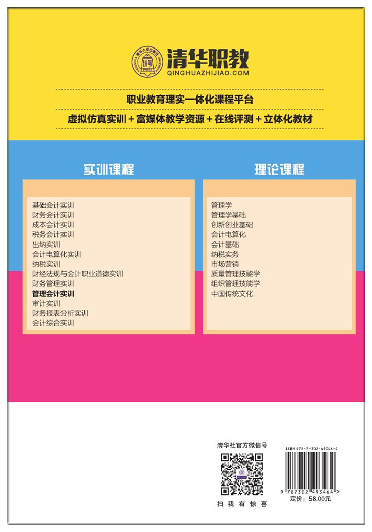 本书配有实训教学平台,按照管理会计的内在规律和企业管理会计岗位的工作流程设计实训业务,具有以下三大特点:①系统性强,体现管理会计的岗位要求;②内容全面,涵盖管理会计的多个方面,管理会计的基本方法、规划与决策会计、控制与业绩评价会计及作业成本法等内容都有详细的实训业务;③预置丰富的内部表单,对接企业真实业务,涉及管理会计岗位的常用计算。平台能够智能化地处理表单计算结果,学生通过反复演练,可以熟练掌握管理会计工作所需的基本技能和基本观念。