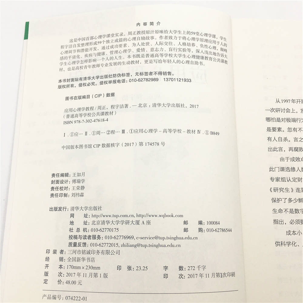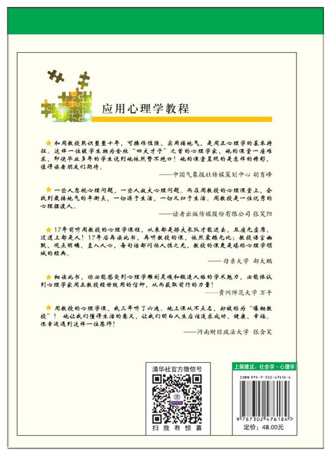 这是中国首部心理学课堂实录。周正教授原汁原味给大学生上的59堂心理学课,学生 程宇洁自发整理形成59个独立成篇的心理自励故事。作者致力于将心理学原理应用于人的 心理调节和潜能开发,通过成功要素、为人处世、人际交往、人格培养、负性心理,颠峰 感的平庸化、疾病与健康、管理心理学、爱情、意志力、盲行实验等,深入浅出地告诉大 学生心理学怎样影响一个人的人生。本书既是普通高等学校大学生心理健康教育公共课教 材,也是高校青年教师专业发展的生动教材,更是写给年轻人的心理自助书。