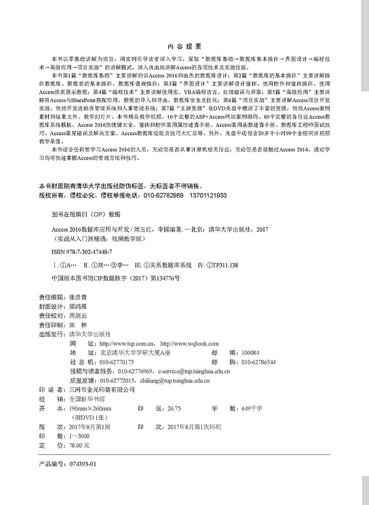 本书以零基础讲解为宗旨,用实例引导读者深入学习,采取“数据库基础→数据库基本操作→界面设计→编程技术→高级应用→项目实战”的讲解模式,深入浅出地讲解Access的各项技术及实战技能。 本书第1篇“数据库基础”主要讲解初识Access 2016和出色的数据库设计;第2篇“数据库的基本操作”主要讲解操作数据库、数据表的基本操作、数据库查询操作;第3篇“界面设计”主要讲解设计窗体、使用控件和窗体操作、使用Access报表展示数据;第4篇“编程技术”主要讲解使用宏、VBA编程语言、处理错误与异常;第5篇“高级应用”主要讲解将Access与SharePoint搭配应用、数据的导入和导出、数据库安全及优化;第6篇“项目实战”主要讲解Access项目开发实战,包括开发进销存管理系统和人事管理系统;第7篇“王牌资源”在DVD光盘中赠送了丰富的资源,包括Access案例素材和结果文件、教学幻灯片、本书精品教学视频、10个完整的ASP+Access网站案例源码、60个完整的各行业Access数据库系统模板、Access 2016快捷键大全、窗体和控件常用属性速查手册、Access常用函数速查手册、数据库工程师面试技巧、Access常见错误及解决方案、Access数据库经验及技巧大汇总等。另外,光盘中还包含20多个小时99个全程同步视频教学录像。 本书适合任何想学习Access 2016的人员,无论您是否从事计算机相关行业,无论您是否接触过Access 2016,通过学习均可快速掌握Access的管理方法和技巧。
