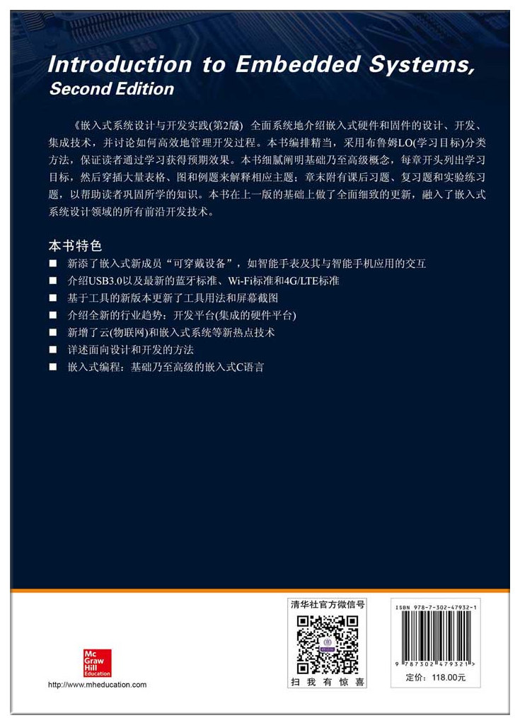 《嵌入式系统设计与开发实践(第2版) 全面系统地介绍嵌入式硬件和固件的设计、开发、 集成技术,并讨论如何高效地管理开发过程。本书编排精当,采用布鲁姆LO(学习目标)分类 方法,保证读者通过学习获得预期效果。本书细腻阐明基础乃至高级概念,每章开头列出学习 目标,然后穿插大量表格、图和例题来解释相应主题;章末附有课后习题、复习题和实验练习 题,以帮助读者巩固所学的知识。本书在上一版的基础上做了全面细致的更新,融入了嵌入式 系统设计领域的所有前沿开发技术