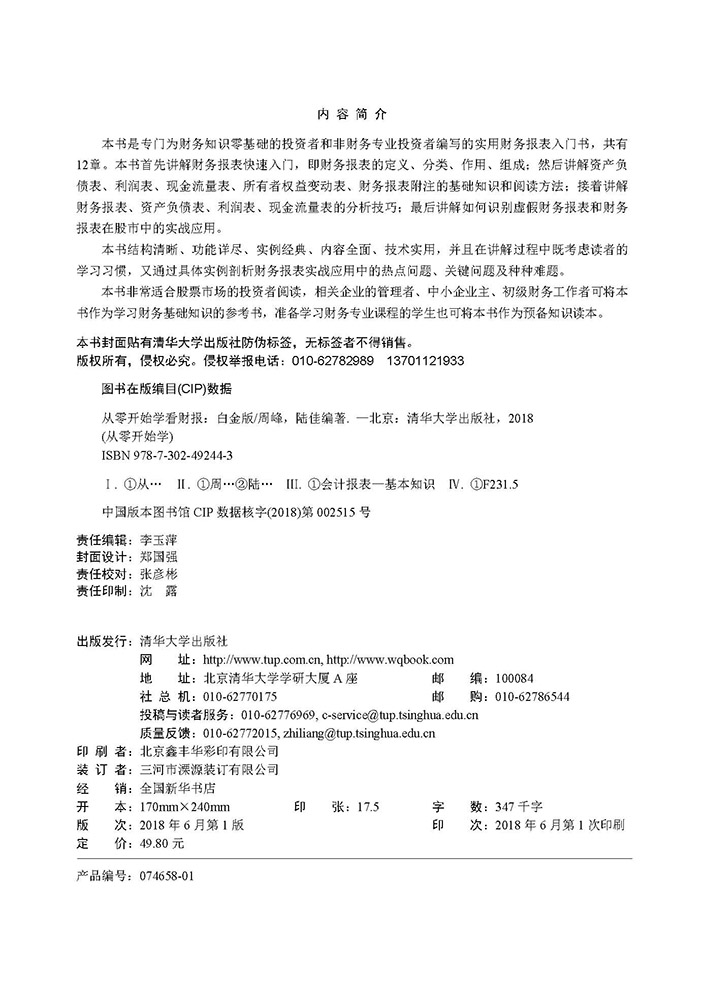 《从零开始学看财报(白金版)》是专门为财务知识零基础的投资者和非财务专业投资者编写的实用财务报表入门书,共有12章。本书首先讲解财务报表快速入门,即财务报表的定义、分类、作用、组成;然后讲解资产负债表、利润表、现金流量表、所有者权益变动表、财务报表附注的基础知识和阅读方法;接着讲解财务报表、资产负债表、利润表、现金流量表的分析技巧;最后讲解如何识别虚假财务报表和财务报表在股市中的实战应用。 《从零开始学看财报(白金版)》结构清晰、功能详尽、实例经典、内容全面、技术实用,并且在讲解过程中既考虑读者的学习习惯,又通过具体实例剖析财务报表实战应用中的热点问题、关键问题及种种难题。 《从零开始学看财报(白金版)》非常适合股票市场的投资者阅读,相关企业的管理者、中小企业主、初级财务工作者可将本书作为学习财务基础知识的参考书,准备学习财务专业课程的学生也可将本书作为预备知识读本。