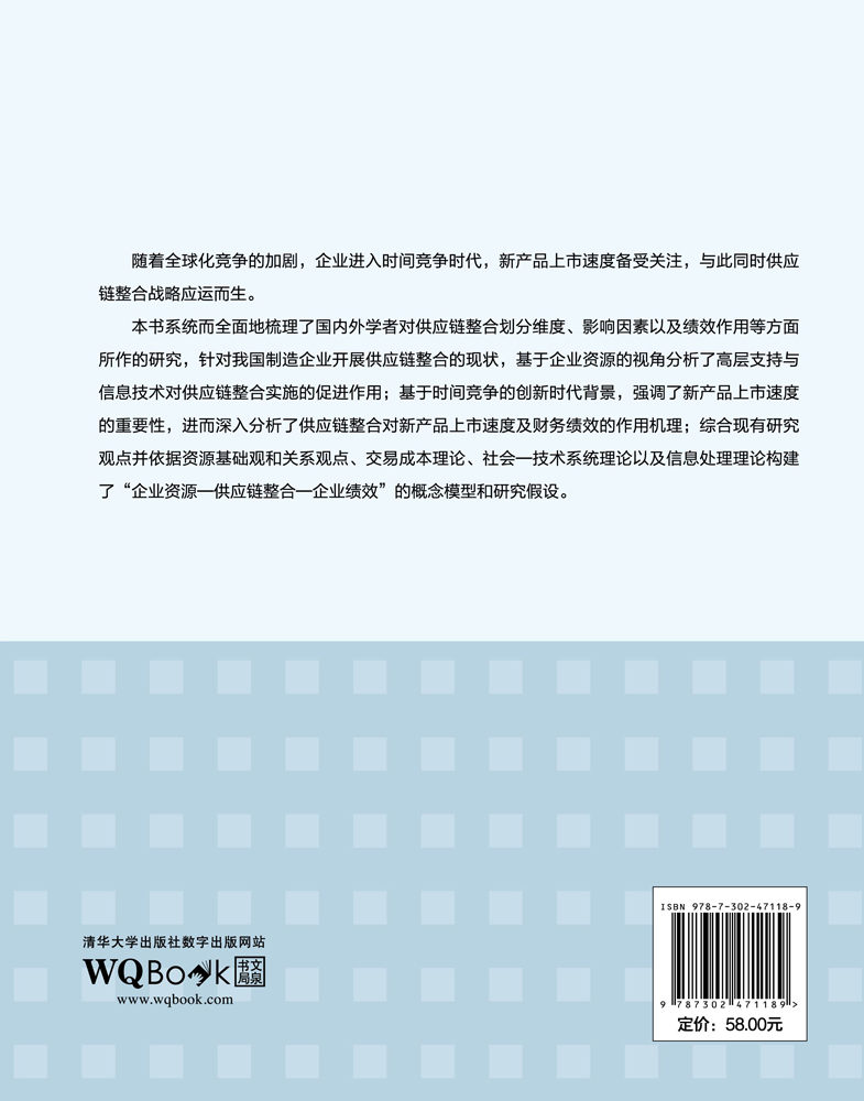 针对当前企业在开展供应链整合中所面临的问题,本书系统而全面地梳理了国内外学者对供应链整合划分维度、影响因素以及绩效作用等方面所做的研究。针对我国制造企业开展供应链整合的现状,本书基于企业资源的视角分析了高层支持与信息技术对供应链整合实施的促进作用;在基于时间竞争的创新时代背景下,强调了新产品上市速度的重要性,进而深入分析了供应链整合对新产品上市速度及财务绩效的作用机理;综合现有研究观点并依据资源基础观和关系观点、交易成本理论、社会—技术系统理论以及信息处理理论构建了“企业资源—供应链整合—企业绩效”的概念模型和研究假设。