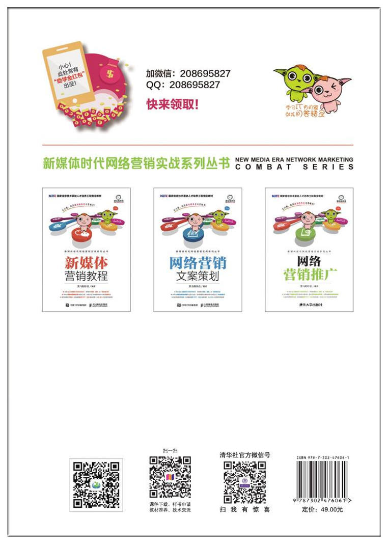 基于“以技术为基础,以销售为导向”的理念,紧密结合当前“互联网+”时代快速发展的现状,从读者角度出发,针对与电子商务、网络营销相关专业的学生及社会从业人员,对知识体系进行了系统的整合,详细介绍了网络营销涉及的各方面内容。 语言通俗易懂,趣味性强。区别于文字描述过于理论化的传统教材,语言描述通俗易懂,并配有大量生动形象的插图,使学习具有趣味性。具有良好的实操性和应用性。将当前网络市场较为实用的相关知识直观地讲解给读者,并配合相应的案例进行演示讲解,操作性强。知识点全面、体系完善。知识内容较为基础、全面,涉及的学科知识面较广,可以全方位地培养读者的网络营销思维和能力。 配套资源丰富。附有配套的教学PPT、题库、教学视频、教学补充案例、教学设计等相关资源。同时,为了帮助初学者及时地解决学习过程中遇到的问题,还提供专业的在线答疑平台,以帮助读者更好地学习和掌握这些知识。<!--[if !supportLineBreakNewLine]--><!--[endif]-->