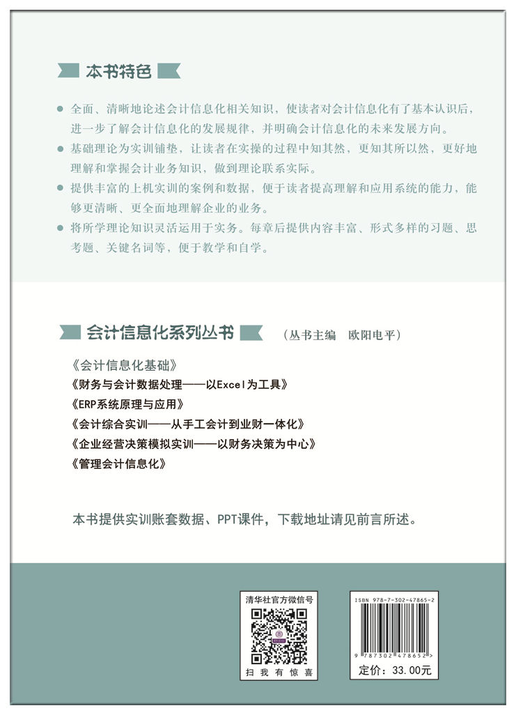 本书主要特色有:1. 全面、清晰地论述了与会计信息化相关的概念,会计信息化的发展历程,会计信息化工作规范,会计信息系统结构与组成,会计信息化的运行平台。使读者对会计信息化有了基本认识后,进一步了解会计信息化的发展规律并明确会计信息化的未来发展方向。2. 基础理论为实训铺垫,让读者在实操的过程中知其然,更知其所以然。3. 提供了丰富的上机实训的案例和数据,便于读者提高理解和应用系统的能力。4. 便于教学和自学。5. 本书还提供了配套资源,包括每章实训部分的账套备份数据,便于读者练习;教学课件(PPT 格式),便于教师授课。