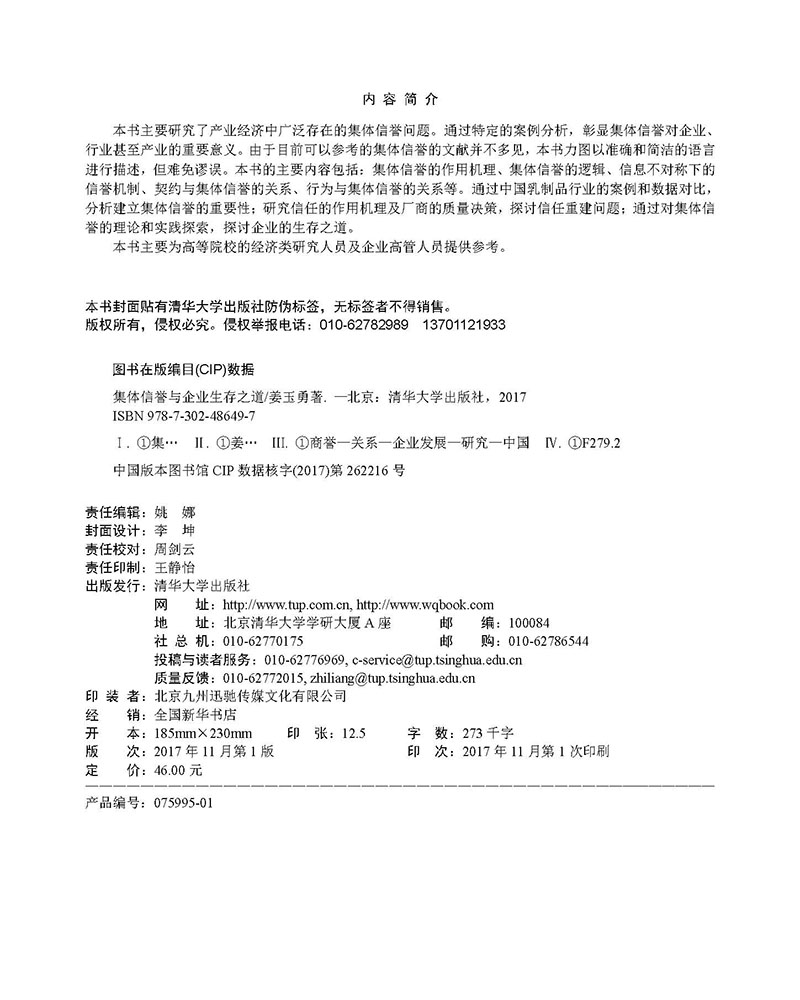 《集体信誉与企业生存之道》主要研究了产业经济中广泛存在的集体信誉问题。通过特定的案例分析,彰显集体信誉对企业、行业甚至产业的重要意义。由于目前可以参考的集体信誉的文献并不多见,本书力图以准确和简洁的语言进行描述,但难免谬误。本书的主要内容包括:集体信誉的作用机理、集体信誉的逻辑、信息不对称下的信誉机制、契约与集体信誉的关系、行为与集体信誉的关系等。通过中国乳制品行业的案例和数据对比,分析建立集体信誉的重要性;研究信任的作用机理及厂商的质量决策,探讨信任重建问题;通过对集体信誉的理论和实践探索,探讨企业的生存之道。 《集体信誉与企业生存之道》主要为高等院校的经济类研究人员及企业高管人员提供参考。