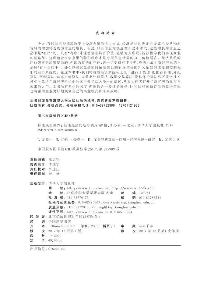 今天,互联网已经彻底改变了经济系统的运行方式,经济增长的决定性要素已经从物质资料的增加转变成为信息的增长。但是,只有信息的快速增长是不够的,这些增长的信息还必须是“有序”的。只有“有序”才能使信息具有价值,能够为人所用,能够指导我们实现商业的新路径。这种包含在信息里的隐形秩序才是今天信息世界的真正价值所在。经济系统的运行确实是纷繁复杂的,但因为算法的存在,这一切变得有律可循,算法也成为新经济系统里那只“看不见的手”。那么算法究竟是如何保障信息的有序增长的?又是如何改变和控制我们的经济系统的?在这本书中,我们将赛博经济系统从上至下进行了梳理,把推荐算法、分配算法、匹配算法、动态定价算法、大数据处理算法、数据交易算法、隐私保护算法和区块链技术及相关算法在新经济组织中的运行做了深入浅出的阐述,从而为读者打开了新经济的现在与未来的大门。本书虽有专业的深度,但也适合一般读者阅读,同时这些创新背后的算法逻辑也将帮助企业更好地规划自己的商业模式和未来战略。