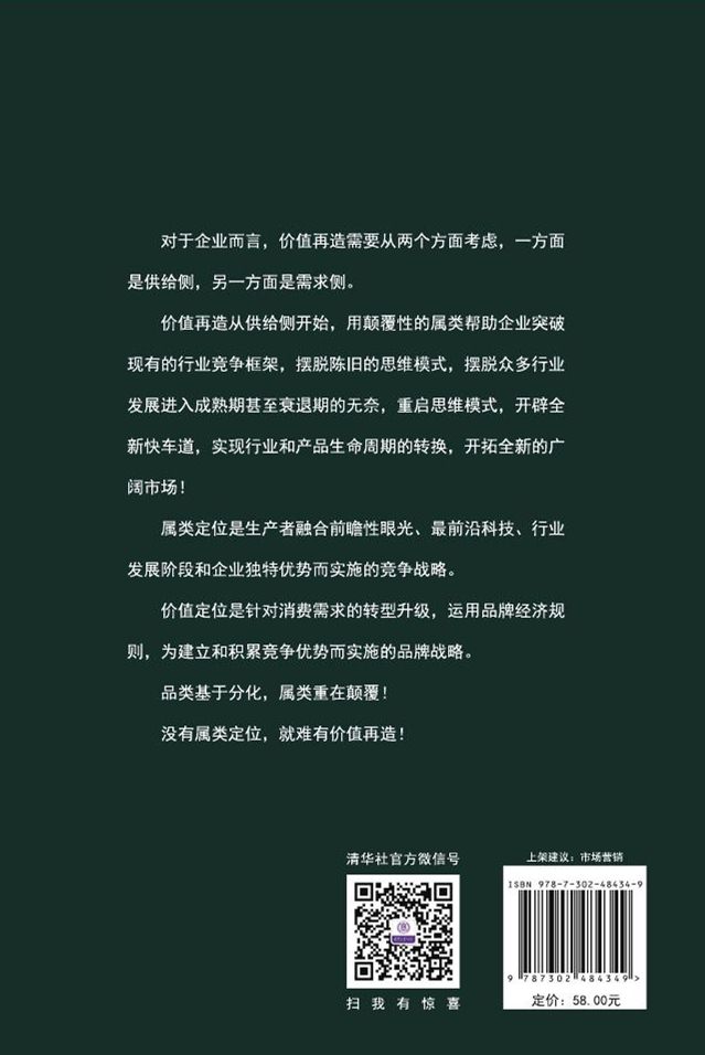 互联网时代的平台化、数字化、跨界融合与开放生态,让市场进入了前所未有的无限度竞争时代。如何找到变化背后的本质和规律?本书提出了具有理论指导性和实战操作性的“双定位模式”,从属类定位和价值定位两个角度连接供给侧和需求侧。指导企业进行价值再造,用颠覆性的属类帮助企业突破现有的行业竞争框架,开拓全新的广阔市场。 什么是“双定位理论”? 任何一个成功的品牌,在消费者心智中成功占据了两个位置,回答了消费者的两个问题: 第一, 你是什么?此为属类定位(品类定位); 第二, 我什么要买你?此为价值定位。 缺一不可! 品牌的核心在于定位,定位不是打飞靶,不是无目标的搜寻。定位有两个重要的基点:一是基于供给侧,或称为生产方;二是基于需求侧,或者消费方。 “双定位”理论最有效地连接了供给侧和需求侧,互为呼应,形成钳形合力,让品牌定位更加精准。 “双定位”理论从供给侧开始,回答消费者第一个问题:你是什么?或者你代表了什么?回答这个问题可能是基于分化的品类,也可能是颠覆性的属类。重要的是要从消费者的角度去思考你是什么,而不是立足于企业内部的定位;品牌定位的另一方面是需求侧,回答消费者第二个问题:我为什么要买你?对于属类定位的分析同时必须考虑什么是消费者认为有“价值”的东西。价值定位和属类定位相呼应,因为全新的属类,才能提供差异化价值。 “双定位”符合消费者购买思考逻辑。 企业所有经营活动的目标是创造顾客。深入了解顾客的购买心理,也是基于两个方向的思考。一个成功的购买过程清晰地回答了消费者的两个问题:消费者通常用属类(品类)表达需求,用价值做出选择: 成功的购买=你是我想要的属类+你能提供我需求的价值 对于消费者来讲,企业认为自己的品牌是什么,产品是什么,并不重要;重要的是他购买的是什么,品牌或产品带给他的价值是什么。 “双定位”战略的实践兼顾竞争导向和需求导向 属类定位的核心是建立差异化、可保护壁垒的竞争优势。企业的创新活动通过全新的品类或独特概念的属类建立差异化竞争优势,从而为消费者提供独特的价值。属类定位所表达的“你是什么”,包含了基于竞争格局、企业优势和消费需求的差异化属性,兼顾竞争导向和需求导向。在考虑了竞争格局和消费价值的同时,还有更为重要的方面,就是企业长期积累的优势!在《价值再造》一书中,称之为企业的“内能量”!只有从企业长期积累的优势出发,兼顾竞争和需求价值的定位,才能够具有真正的市场竞争力!