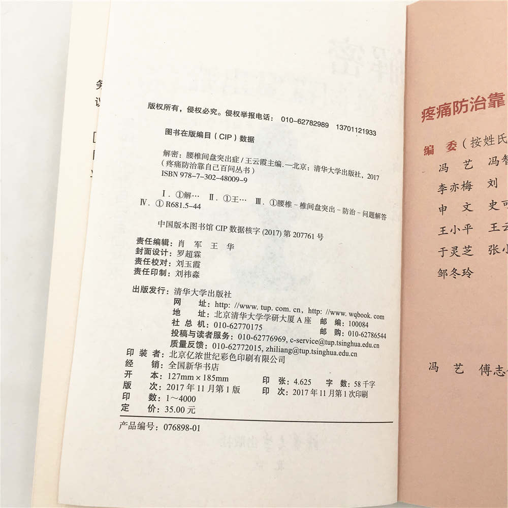 前言 腰腿痛是临床上患者求医问诊的常见病、多发病,引起腰腿痛的原因复杂。“腰椎间盘突出症”是引起腰腿痛的常见病因之一,近年来随着影像医学的发展,“腰椎间盘突出症”这个病名可以说已经是家喻户晓。在门诊经常遇到一些腰腿痛的患者,一开口就告诉医生“我得‘腰椎间盘突出症’”了;也经常听到患者问“我只有下肢痛没有腰痛,为什么医生说我是腰椎间盘突出症?”“我的腰腿痛拍了腰椎片子,为什么医生还要我做腰椎 CT?” “腰椎间盘突出症用牵引治疗能治好吗?”“椎间孔镜手术治疗腰椎间盘突出症是微创吗?”“腰椎间盘突出症手术后还会复发吗?”患者常会有许多问题想问医生,可是由于门诊里人 多,医生没有太多时间来解答患者的许多提问。 为了解决这些问题,我们在中国女医师协会疼痛专业委员会的领导支持下,组织临床一线骨干医师编写了这本《解密·腰椎间盘突出症》科普书籍,深感荣幸和意义重大!本书以问答的形式,从认识篇、诊断篇、治疗篇、预防篇四个方面力求用通俗易懂的语言对腰椎间盘突出症患者最关心的问题做出解答,希望能对患者有所帮助。因水平有限,时间仓促。错误及不当之处,恳请读者批评指正。谢谢! 王云霞2017年 5月