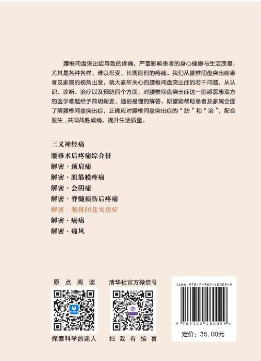 腰椎间盘突出症导致的疼痛严重影响到患者的身心健康与生活质量,尤其是各种各样、难以忍受、长期剧烈的疼痛;我们从腰椎间盘突出症疼痛患者及家属的视角出发,就大家所关心的腰椎间盘突出症的若干问题,从认识、诊断、治疗以及预防与康复等四个方面,对“腰椎间盘突出症”这一困惑医患双方的医学难题尽可能地给予简明扼要、通俗易懂的解答。期望能帮助患者及家属全面了解、理解腰椎间盘突出症,能正确应对腰椎间盘突出症的“防”和“治”;配合医生;共同战胜顽痛;提升生活质量。