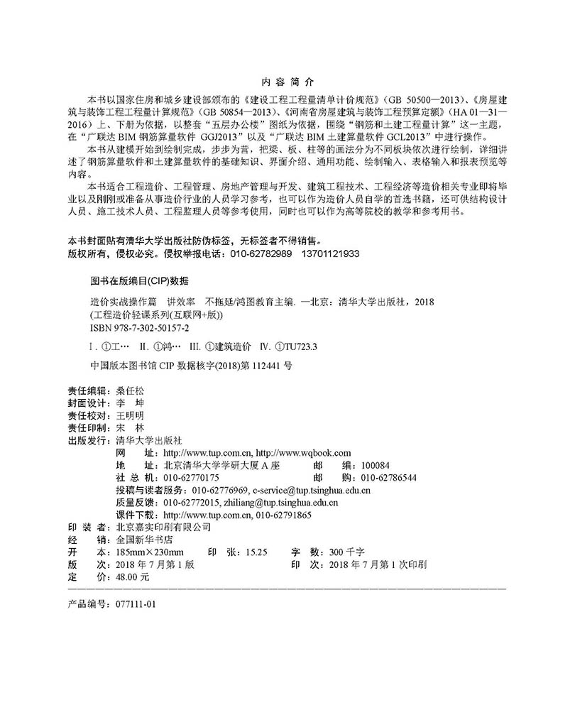 《造价实战操作篇 讲效率 不拖延》以国家住房和城乡建设部颁布的《建设工程工程量清单计价规范》(GB 50500—2013)、《房屋建筑与装饰工程工程量计算规范》(GB 50854—2013)、《河南省房屋建筑与装饰工程预算定额》(HA 01—31—2016)上、下册为依据,以整套“五层办公楼”图纸为依据,围绕“钢筋和土建工程量计算”这一主题,在“广联达BIM钢筋算量软件 GGJ2013”以及“广联达BIM土建算量软件GCL2013”中进行操作。 《造价实战操作篇 讲效率 不拖延》从建模开始到绘制完成,步步为营,把梁、板、柱等的画法分为不同板块依次进行绘制,详细讲述了钢筋算量软件和土建算量软件的基础知识、界面介绍、通用功能、绘制输入、表格输入和报表预览等内容。 《造价实战操作篇 讲效率 不拖延》适合工程造价、工程管理、房地产管理与开发、建筑工程技术、工程经济等造价相关专业即将毕业以及刚刚或准备从事造价行业的人员学习参考,也可以作为造价人员自学的首选书籍,还可供结构设计人员、施工技术人员、工程监理人员等参考使用,同时也可以作为高等院校的教学和参考用书。