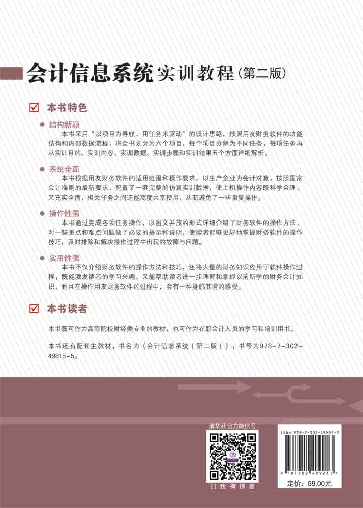 三是操作性强。为了有效地指导读者上机操作实训,本书以图文并茂的形式介绍了财务软件的操作方法和技巧,对一些重点和难点问题还做了必要的提示和说明,使读者能够更好地理解和掌握财务软件的内部工作原理,及时排除和解决操作过程中出现的故障与问题。