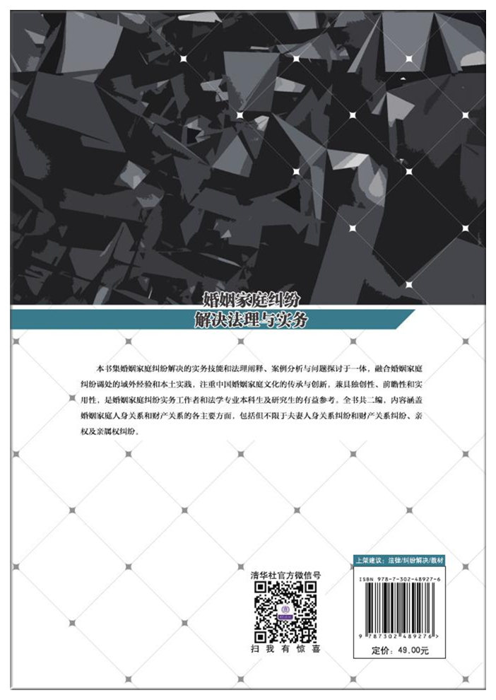 婚姻家庭纠纷解决法理与实务一书的特色:第一,全面阐释婚姻家庭常见纠纷解决的法理;第二,突出婚姻家庭纠纷的热点问题和难点问题;第三,理论与实务相结合。