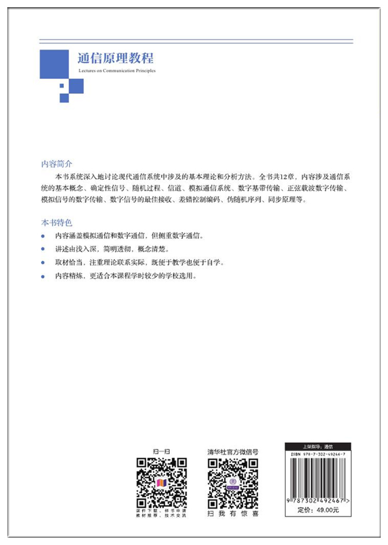 本书深入和系统地讨论现代通信系统中涉及的基本理论和分析方法。内容涵盖模拟通信和数字通信,但侧重数字通信。 全书共12章,内容涉及通信系统的基本概念、确定性信号、随机过程、信道、模拟通信系统、数字基带传输、正弦载波数字传输、模拟信号的数字传输、数字信号的最佳接收、差错控制编码、伪随机序列、同步原理等。各章均设有习题和思考题,书后附有部分习题答案。 本书内容丰富,取材恰当,讲述由浅入深,简明透彻,概念清楚,注重理论联系实际,既便于教学也方便广大工程技术人员参考。 本书可作为“通信原理”课程的本科生和研究生教材,也可作为研究生入学考试的参考书,还可作为相关大学教师和科学技术人员的参考资料。