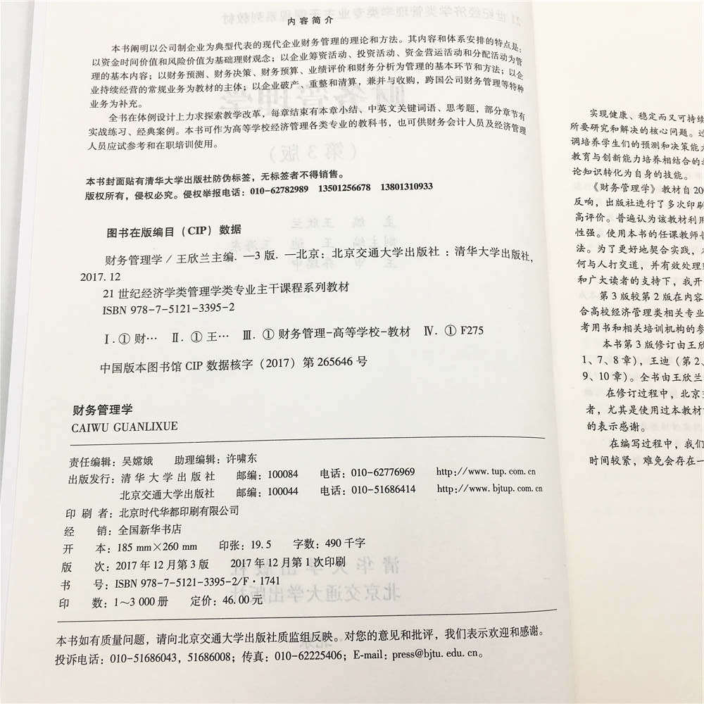 第3版前言 实现健康、稳定而又可持续发展,从而最大限度地创造财富或价值,这是企业财务管理所要研究和解决的核心问题。过去几年里,我们不断收到老师的反馈,希望本书能够更加强调培养学生们的预测和决策能力,更符合学生的期望。本教材的修订更加注重贯彻专业基础教育与创新能力培养相结合的教学要求,旨在帮助今天的学生,即未来的管理者,将所学理论知识转化为自身的技能。 《财务管理学》教材自2005年9月出版并投放市场以来,已再版,并得到市场的良好反响,出版社进行了多次印刷,印数已达到万余册。使用过该教材的读者对该教材给予了较高评价。普遍认为该教材利用率高、理论与实践兼顾、内容丰富系统、体例设计合理、可读性强。使用本书的任课教师普遍反映该教材不仅强调理论方面的知识,而且着重介绍实践方法。为了更好地契合实践,本书还涉及一些行为原则方面的理论知识,因为财务管理人员如何与人打交道,并有效处理财务关系,也是财务管理中至关重要的方面。鉴于此,在出版社和广大读者的支持下,我开始着手该书的第3版修订工作。 第3版较第2版在内容上进行了完善,集实用性、理论性和资料性于一体。本书比较适合高校经济管理类相关专业开设的“财务管理学”课程使用,也可作为相关从业人员的参考用书和相关培训机构的参考教材。 本书第3版修订由王欣兰总策划,具体编写与再版修订人员及分工如下:王欣兰(第1、7、8章),王迪(第2、3章),王海东 (第4、5章),徐素波(第6章),李树坤(第9、10章)。全书由王欣兰统稿并主编,王迪、王海东副主编,乔瑞中负责主审。 在修订过程中,北京交通大学出版社的吴嫦娥编辑给予了大力支持,以及不少热心读者,...