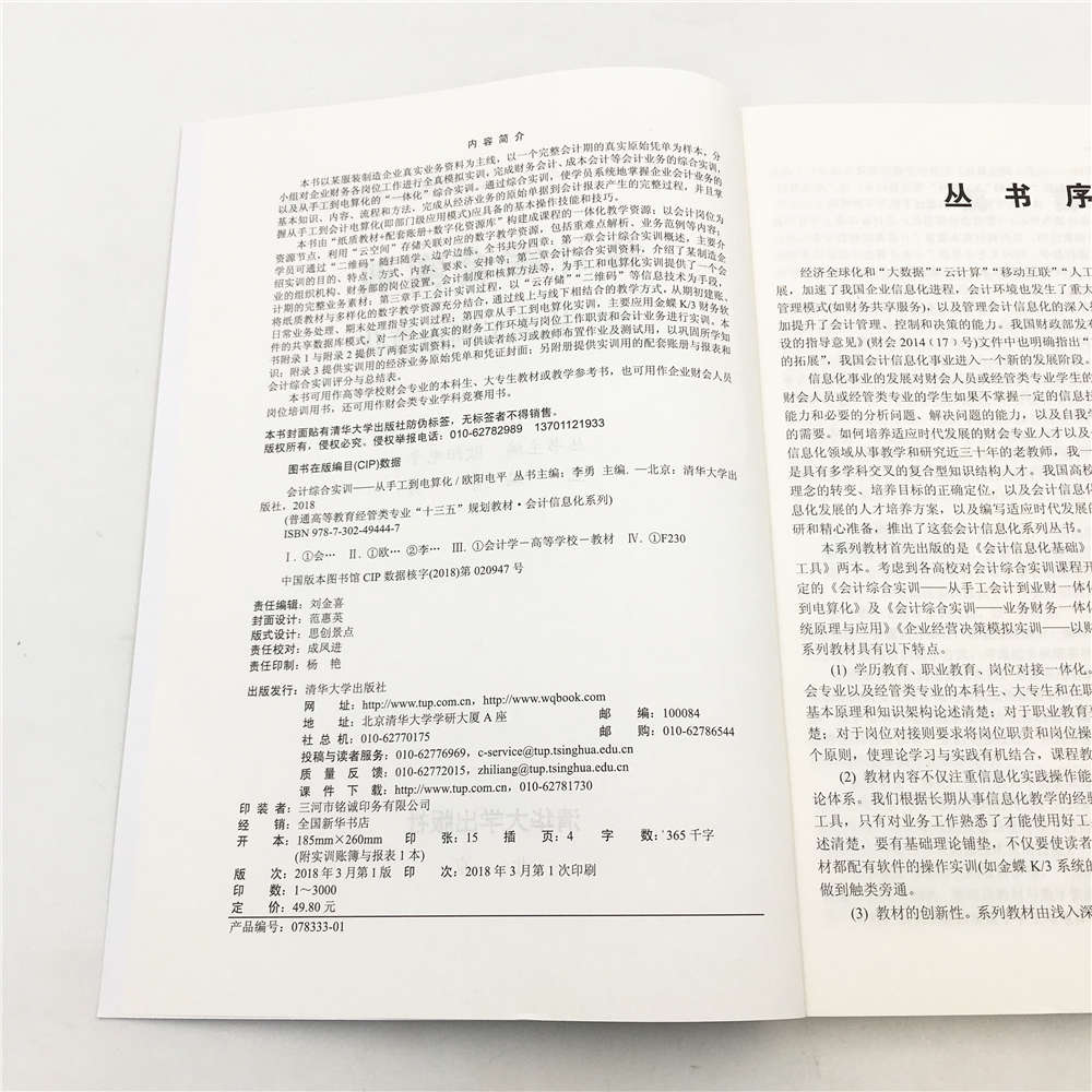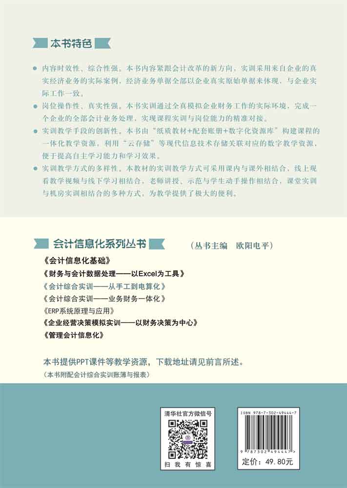 内容时效性、综合性强。《会计综合实训——从手工到电算化》内容紧跟会计改革的新方向,实训采用来自企业的真实经济业务的实际案例,经济业务单据全部以企业真实原始单据来体现,与企业实际工作一致。岗位操作性、真实性强。本书实训通过全真模拟企业财务工作的实际环境,完成一个企业的全部会计业务处理,实现课程实训与岗位能力的精准对接。实训教学手段的创新性。本书由“纸质教材+配套账册+数字化资源库”构建课程的一体化教学资源,利用“云存储”等现代信息技术存储关联对应的数字教学资源,便于提高自主学习能力和学习效果。实训教学方式的多样性。本教材的实训教学方式可采用课内与课外相结合,线上观看教学视频与线下学习相结合,老师讲授、示范与学生动手操作相结合,课堂实训与机房实训相结合的多种方式,为教学提供了极大的便利。