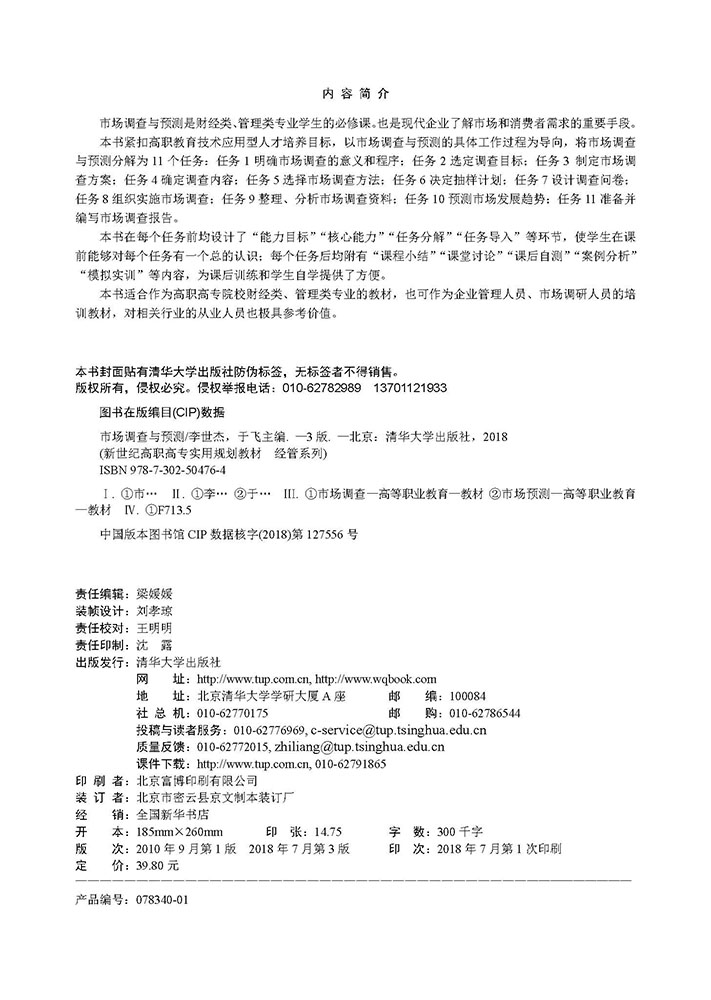 第3版前言 随着经济全球化的发展,市场竞争更加激烈,能否及时、准确、全面地获取市场信息,并通过分析市场信息准确地预测和把握市场发展趋势,已经成为企业提高决策能力和管理水平、提高整体竞争力的关键因素。因此,各行各业对信息的需求与利用都在不断加大,对各类数据的搜集与分析也更加重视。为此,我们在参阅国内外大量资料和最新科研成果的基础上,对第2版教材进行了必要的调整和修订,形成了本书。 本书紧扣高职高专教育技术应用型人才培养目标,与企业的营销管理实践紧密结合,基于市场调查与预测的具体工作过程,将市场调查与预测分解为11个任务:任务1 明确市场调查的意义和程序;任务2 选定调查目标;任务3 制定市场调查方案;任务4 确定调查内容;任务5 选择市场调查方法;任务6 决定抽样计划;任务7 设计调查问卷;任务8 组织实施市场调查;任务9 整理、分析市场调查资料;任务10 预测市场发展趋势;任务11准备并编写市场调查报告。本书在内容的处理上突出应用、精选实例,能帮助读者学会处理市场调查与预测中的各种问题。本书在每个任务前均设计了“能力目标”“核心能力”“任务分解”“任务导入”等环节,使学生在课前可以对每个任务有一个总的认识;每个任务后均附有“课程小结”“课堂讨论”“课后自测”“案例分析”“模拟实训”等内容,为课后训练和学生自学提供了方便。 本书体现了全新的设计理念,既重视教师的精讲,又重视学生的实训,强调师生的互动效应。 本书由河北软件职业技术学院李世杰、于飞任主编,王丽、孙晓然、韩大平任副主编,李世杰编写大纲并最终修改定稿。各项任务的编写分工如下:任务1、4、10由河北...