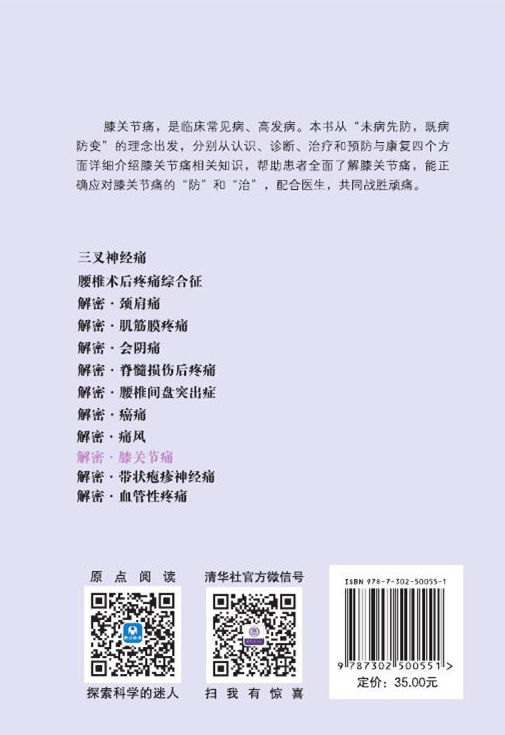 前言 膝关节痛,是一种常见病、高发病。可以说,人在一生中的不同阶段会遇到各种原因导致的膝关节痛,如青少年可能是生长痛,成年人可能是运动损伤,而老年人常见的则是骨关节炎。除此以外,肿瘤患者、风湿性疾病患者、痛风患者、抑郁症患者也可能会出现膝关节痛的表现。膝关节痛病因错综复杂,不同年龄、不同疾病阶段的患者,其治疗方案也有所不同。主治医师或患者对该病认识不足,常常导致病情迁延不愈,并严重影响生活质量。随着医学的进步,无创、微创以及精准医学的发展,新技术、新方法层出不穷,很多治疗方案是以往闻所未闻的。所以,推出一本全新的科普读物,介绍膝关节痛的病因、诊治、康复等相关知识,希望患者在诊前诊后阅读能有所获益。 感谢中国女医师协会给予这次机会,作为主编组织国内专家参与撰写《疼痛防治靠自己百问丛书》的《解密·膝关节痛》分册。恰好在本书完稿之际,国际疼痛学会(International Association for the Study of Pain,IASP)宣布将 2017—2018年 “世界抗痛年”主题定位为“卓越疼痛教育传播年 (Global Year for Excellence in Pain Education),其中很重要的一部分就是对患者的宣教。一张处方单、一次手术或许能把病入膏肓的患者救回来,但所惠及的仅仅是一个人;而一篇优秀的医学科普文章、一本优秀的科普书所受益的将远不止一人,是百人、千人,甚至更多。由此可见,科普读物本身就是一剂大众“良药”。我们深知,医学专业知识的科普,并不是单纯地讲解经典专业书籍,或照搬、照抄最新文献给广大读者,而是另一门学问。在具备专业...