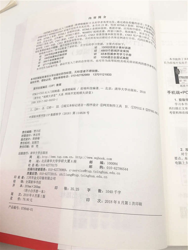 2. 本书面向零基础的初学者,通过“一个知识点+一个例子+一个结果+一段评析+一个综合应用”的写作模式,全面细致地讲述了HTML5+CSS3实际开发中所需的各类知识,由浅入深,循序渐进。