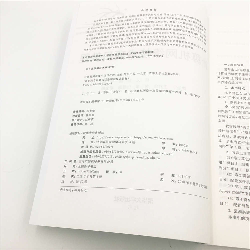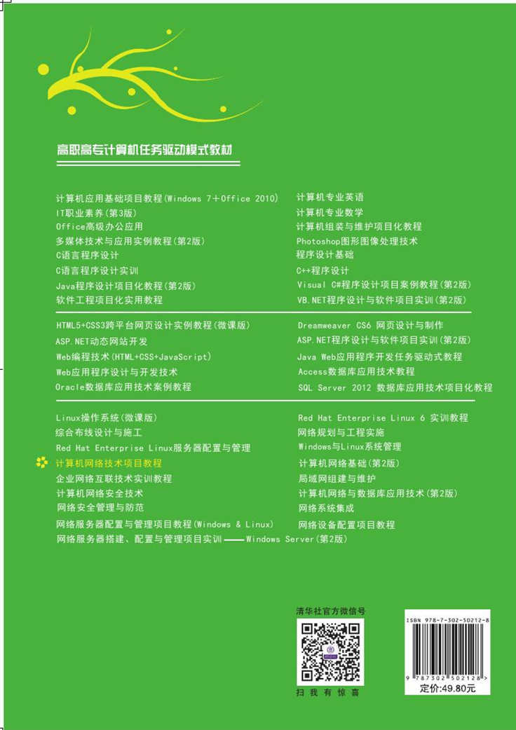 (本书再版的新形态教材(纸质教材+电子活页)已经出版,订购该教材后可向出版社索要含视频的全套备课包。 点击查看新书信息: http://www.tup.tsinghua.edu.cn/bookscenter/book_09557901.html书名:《计算机网络技术项目教程(第2版)(微课版)》 ISBN:9787302597605 出版日期:2022.03.01) 杨云,男,教授,计算机网络技术类畅销教材作者,Linux国家级精品课程负责人,Linux国家精品资源共享课程负责人,山东省教学名师,首届教育部行指委计算机委员会委员,教育部高等教育自学考试指定教材项目“互联网软件与应用”负责人。出版专著2部,主编教材近20余部,其中9本获“十二五”职业教育国家规划教材称号、7本获得省级以上奖励和表彰。主持的 “五核协同的Linux操作系统教学资源建设”获省级教学成果二等奖。杨云教授是微软系统工程师(MCSE),多次负责全国的红帽Linux和微软Windows服务器的培训工作。 全书共分四篇:第一篇 循序渐进学习TCP/IP;第二篇 步步为营搭建局域网;第三篇 运筹帷幄组建Windows Server 2008网络;第四篇 未雨绸缪构筑网络互联安全。共有14个教学项目和19个拓展实训项目。