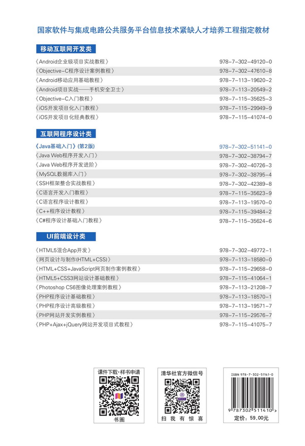 《Java基础入门(第2版)》是Java语言编程的经典教材,其第一版发行近20万册。历久弥新,精心修订。全书共11章,包括Java开发环境的搭建及其运行机制、基本语法、面向对象的思想、常用API、集合、IO、GUI、JDBC、多线程和网络编程等内容。提供了208个经典案例,5个综合案例,219道经典习题。配套的数字教学资源丰富,包括精美PPT、1500道测试题、40小时教学视频。 学生可关注播妞学姐公众号boniu1024,教师可添加微信/QQ:2011168841