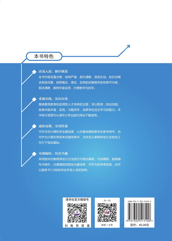 ★由浅入深, 循序渐进全书内容设置合理,结构严谨,层次清晰,语言生动。知识点阐述系统完整,按照概念、理论、实例的讲解顺序安排章节内容,叙述清晰,案例丰富实用,方便教学与自学。★重视实践,突出应用围绕素质教育和应用型人才培养的主题,学以致用,突出技能。各章内容丰富,实例、习题详尽,培养学生自主学习的能力。★通俗易懂 ,实用性强可作为非计算机专业基础课、公共基础课的教学及参考用书,也可作为计算机等级考试辅导用书,为学生从事程序设计及相关工作打下坚实基础。★可视编程,培养兴趣采用面向对象程序设计方法进行可视化编程,代码精简,容易编写与维护。注重编程技能及兴趣培养,可作为初学者首选,也可以服务于C/S结构专业开发人员的培养。