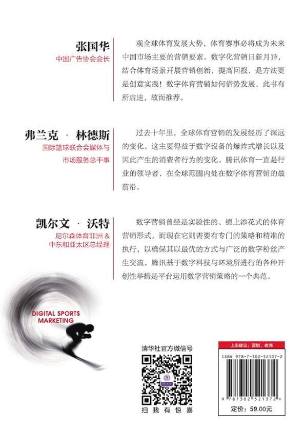 丁明锐,腾讯体育副总经理,全面负责腾讯体育的商业化工作,与国内外品牌联手打造了众多成功的体育营销案例,被中国广告协会、中国数字化营销与服务产业联盟聘为专家委员。陈宁,营销学博士,新西兰坎特伯雷大学市场营销学高级讲师、博士生导师,清华大学体育产业发展研究中心研究员。主要研究方向为旅游体育消费者心理和行为,以及职业竞技体育的品牌开发和企业管理。谌莉,博士,北京体育大学体育商学院工商管理教研室主任、副教授,清华大学体育产业发展研究中心研究员。主要研究领域为体育产业管理、体育营销、体育品牌管理及体育服务运营管理。
