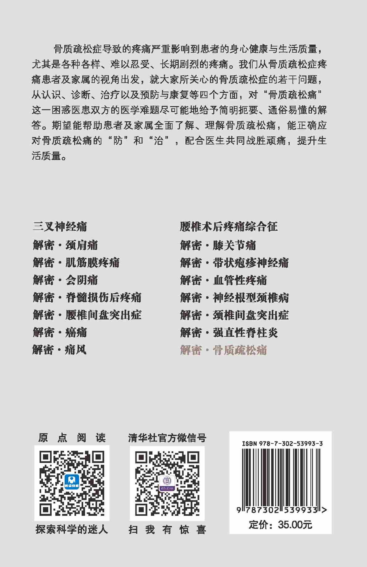 《解密·骨质疏松痛》历经多次修改终于和各位读者见面了。骨质疏松是老年人常见的情况,也是慢性疼痛的常见原因。撰写本书的目的是帮助大家了解骨质疏松、自我防治骨质疏松、预防骨质疏松的严重并发症。为保障本书的专业性,我们邀请疼痛科、内分泌科、骨科、麻醉科多个相关科室的高年资医师撰写自己最擅长的领域。同时我们还邀请著名医学科普作家子琳为此书进行了修改与润色,使我们的讲述更贴近生活,更易理解。本书适合各年龄段非医学专业人士阅读,同样适合初入医学大门的医学生阅读,期待各位读者阅读本书后能够有所收获,真正预防骨质疏松和相关并发症。