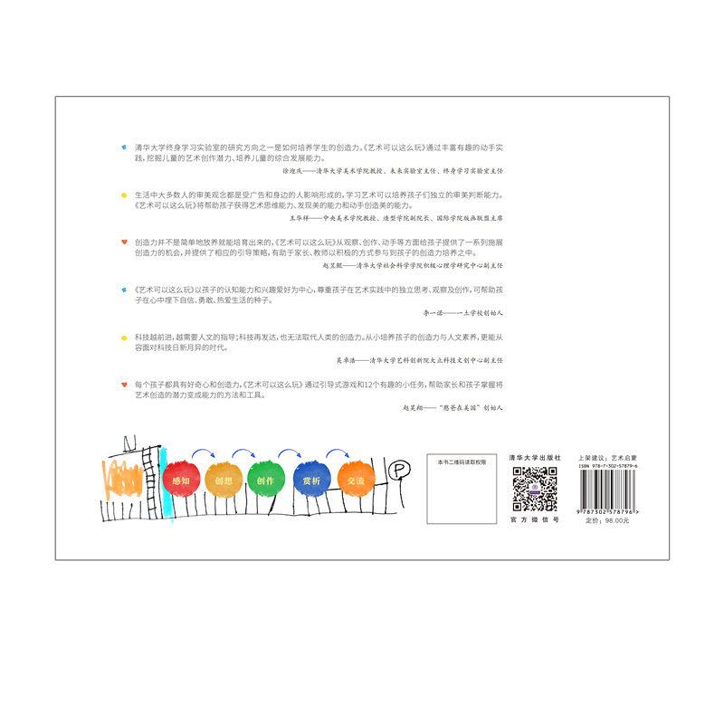 前 言 读书是一个吸纳的过程,一本好书能使人获得知识、开阔视野,在掩卷之后指导实践、完善思想、积累经验;读书也是一个摒弃的过程,一本好书能让人辩证思考,并重新审视自己,更新观念、养成习惯。 《艺术可以这么玩》是一本为培养未来的终身学习者而编写的艺术启蒙书籍,通过孩子用书和家长用书,全方位地培养孩子保持长久的学习热情、掌握科学的学习方法、提升发现美和表现美的能力,并为多学科融合(STEAM)提供形象灵感的来源和自由创作的思路。 《艺术可以这么玩》是一位老师,一位好的老师能激发孩子主动进行自我教育。依照激发主动性的顺序,我们设计了12个有趣的任务,帮助家长用开放式的讨论、积极的评价与孩子们探讨艺术,并且为之提供相关的知识储备和简单实用的工具参考。 《艺术可以这么玩》是一位同学,学习的路上不能缺少同伴的支持和反馈。我们收录了50多件小朋友的作品,针对同一个任务,你可以看到来自其他小朋友的不同表现。我们也期待着你的作品加入其中! 《艺术可以这么玩》是一间小小的美术馆,向你展示来自国内外的绘画、建筑和工艺品,你可以从中看到古今中外的艺术家们是怎样脑洞大开地诠释和你相同的创作主题的。 《艺术可以这么玩》是一个游戏,玩过之后,你会回味这个有趣的过程,也会发现玩耍和学习其实就是一回事,从而对艺术学习建立起长久的热情和信心。 《艺术可以这么玩》还是另一个你,通过创作和实践,你能发现一个勇敢自信的自己。通过与自己对话,你开始理解如此多元的世界,用创新的方式主动创造更美好的生活。