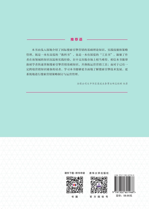基于Google的搜索引擎营销是跨境电子商务最主要的在线营销方式,包括搜索引擎优化、搜索引擎广告两大方式,兼具操作灵活、功能丰富、效果直观等特点。 本书强调理论与应用的紧密结合,从搜索引擎的基本原理和功能入手,对搜索引擎优化和搜索引擎广告的有关内容进行了完整的阐述,对操作流程和步骤进行了详细的讲述,最后深入分析优化层面,形成一套完整的搜索引擎营销体系。全书以实践为基础,从策略制订到操作执行,帮助读者全面了解搜索引擎营销的各个方面。 本书共分为10章,针对海外搜索引擎营销的初学者及应用者,循序渐进,内容涵盖搜索引擎优化和搜索引擎广告的概念和基本操作、数据分析和效果优化,以及整体营销推广策略的制订和一些实用工具的使用。每章都对知识点进行了全面和详细的讲解,便于读者理解,并配以案例和练习题,帮助读者更好地结合实际运用。