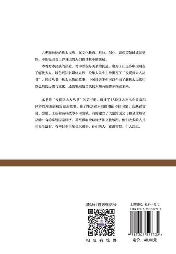 本册选取了18位犹太杰出企业家和经济管理者。他们生活在不同时期的不同国家,活跃在贸易、银行、工业和高科技等不同领域。其中一些人建立了“李维斯”“雅诗兰黛”“甲骨文”“谷歌”等大型跨国公司和全球知名的超级品牌;还有几位掌管整个国家的经济,甚至影响了全球经济和文化版图。他们中的大多数人并非天生富有,有些甚至在早年备尝艰辛。透过他们的成功故事,读者们能看到智慧、冒险以及命运的跌宕起伏,并从中获得启迪。
