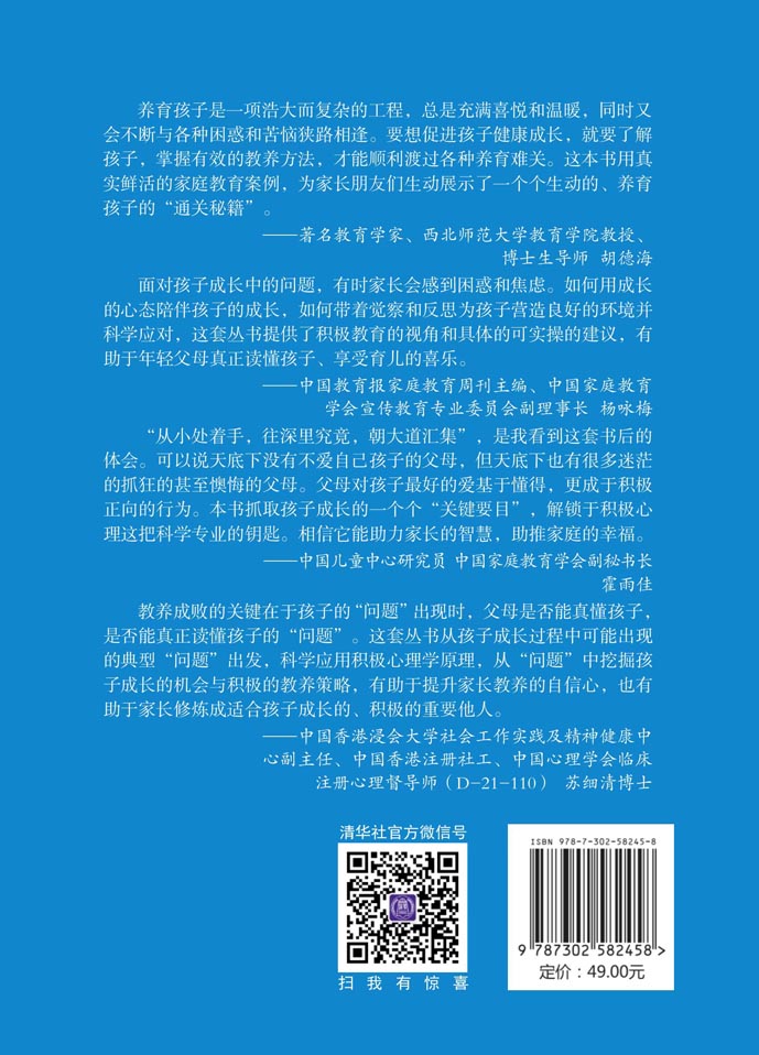 家庭是孩子的第一所学校,家长是孩子的第一任老师,更是孩子终身的老师。家庭教育是人生教育的起点和根基,是一个人接受最早、时间最长、影响最深的教育,培养的是孩子“日用而不觉”的价值观。古希腊著名教育家、哲学家柏拉图曾说:“一个人从小受的教育把他往哪里引导,能决定他后来往哪里走。”儿童期是孩子与家长相处最长的一段时间,是家庭教育的最佳时期。对于每个孩子而言,家庭教育从他出生开始并伴随其成长,对于他能力的开发、生活习惯的形成起着十分重要的作用,将影响着他人格的形成与个体社会化的发展,以及未来人生的发展方向。可以说,家长是影响一个孩子生命及其身心发展的关键所在。家长虽然不是专业的教育工作者,但对孩子身体力行的教育和耳濡目染的影响却远远胜过老师;家庭教育虽然不如学校教育系统和规范,但比起学校教育更具有特殊的针对性、实效性,是为孩子成长打底色的工程。 人生百年,立于幼学。幼儿期是一个人成长中非常重要的时期,从身体和大脑发展来看,与婴儿期(3岁以前)相比,孩子在这一时期身体生长发育速度相对减缓,但与生命中的其他阶段相比,其身体发展还是要快得多,主要特点是日趋成熟。幼儿的大肌肉运动能力逐渐提高,手眼协调能力和小肌肉的控制能力也在迅速发展与完善,这就使得他们能越来越熟练地运用双手,进行丰富多样的探究活动。与婴儿期相比,幼儿的大脑结构已经比较成熟,其高级神经活动的基本过程—兴奋和抑制机能也在不断增强。兴奋过程的增强主要表现为幼儿觉醒时间的延长,这使得他们有更多的时间去探索外部世界;皮质抑制机能的增长,使得幼儿对事物的分辨能力更加精确,能逐步控制自己的行为,减少冲动,有利于良好习惯和个性...