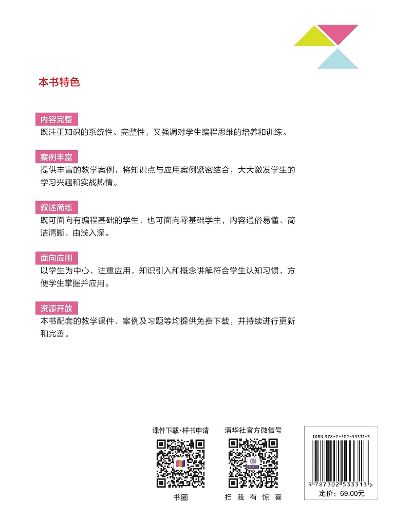 本书是作者多年C++教学经验的总结,全书主要介绍面向对象程序设计的基本概念,全面、系统地介绍了C++语言的基本语法和编程方法,详细地讲述了C++语言面向对象的重要特征: 类和对象、继承和派生类、多态性和虚函数等,同时结合学生实验案例,介绍应用C++语言解决实际问题的方法和流程。本书配有丰富的例题和习题,便于读者学习和巩固知识。 本书可以作为高等学校教材,适用于计算机类、信息管理类以及电子信息类等相关专业的本科生教学,总学时可安排为72学时,其中讲授40学时,上机实验32学时。本书也可作为教学参考书,还适合有需要的读者自学使用。