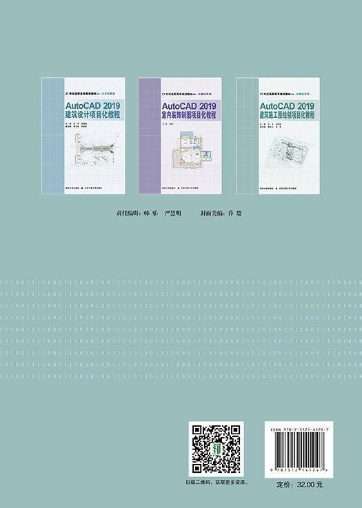 《AutoCAD2019建筑施工图绘制项目化教程》全书共8个项目,项目1为AutoCAD2019基本操作,项目2通过简单图形的绘制讲述AutoCAD二维绘图命令和二维修改命令的使用方法,项目3讲述建筑施工图中常用的图元和图块的绘制、文字和工程标注等知识,项目4至项目7详细讲述某办公楼建筑总平面图、建筑平面图、建筑立面图、建筑剖面图的绘制方法和技巧,项目8通过建筑平面图的打印实例讲述AutoCAD打印图形的方法。