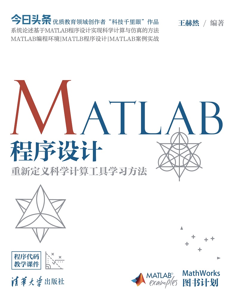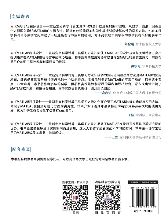 前言 MATLAB是一款由MathWorks公司推出的科学计算软件,是用于科学与工程计算的高效的高级编程语言。MATLAB拥有极为强大的功能,是科学家与工程师的必备工具。本书强调MATLAB软件的精髓和应用性,重新定义了高效实用的MATLAB软件学习方法。 1. MATLAB: 科学家与工程师的必备神器 MATLAB在处理矩阵运算方面有着极强的先天优势,它将矩阵高性能数值计算与图形可视化相结合,将矩阵化程序设计与简单友好的编程语法相结合,被广泛应用在几乎所有科学与工程领域,是科学思维和数学功能的具象体现,也是科学计算领域杰出的软件工具。MATLAB除了在数学、图形与编程领域表现优异,还拥有海量优质工具箱、实时脚本编辑器、图形用户界面设计工具AppDesigner、Simulink组件等强大功能,广泛应用于数学教学、分析数学模型、数据处理及可视化、算法开发、软件制作、动态系统仿真分析等场景,是理工科学生应该深入学习的软件工具。 2. 本书特色: 抓住思想核心,结构化学习路线 本书基于MATLAB R2020a进行编写,与同类图书相比具有如下诸多特色: (1) 强调矩阵思想核心,体会基于矩阵的数据结构与程序设计。 (2) 精心编排结构化的高效学习路线,全面涵盖软件主线功能。 (3) 开辟市面罕见的AppDesigner教学,深挖App设计思想与技术。 (4) 精编极简实用例程、实时脚本助力教学,极大降低学习成本。 3. 高效实用: 重新定义MATLAB学习方法 本书采用一套快捷有效的MATLAB学习策略安排章节内容,章节分布极为考究,建议读者...