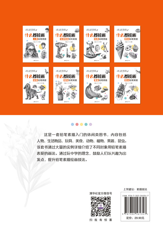 素描铅笔画系列丛书“什么都能画”属于素描入门休闲类图书。该套丛书包括《动物铅笔素描》《植物铅笔素描》《昆虫铅笔素描》《美食铅笔素描》《果蔬铅笔素描》《玩具铅笔素描》《生活物品铅笔素描》《人物铅笔素描》,共八本,介绍了素描铅笔画入门的各种题材。 该套丛书内容丰富,案例典型,通过大量的实例详细介绍了素描铅笔画的绘画方法、不同对象用铅笔表现的画法,是提高素描技能、练习素描手绘的好帮手。 由于时间紧,且水平有限,难免有不足之处,望广大读者批评指正。