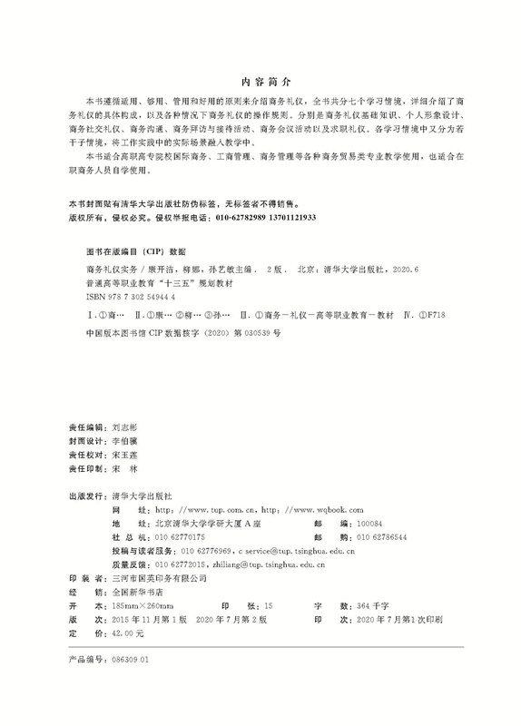 主要介绍了商务人士在社会交往活动中应掌握的礼仪规范,包括商务会议礼仪、商务仪式礼仪、商务餐饮礼仪、商务办公礼仪、商务涉外礼仪等方面的禁忌及要求,可帮助读者全面了解商务礼仪的各个环节,提升个人形象。深入浅出、形象生动、翔实具体,集理论性、实践性、知识性和可操作性于一体。