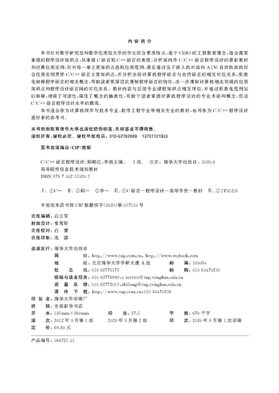 本书针对教学研究型和教学应用型大学的学生综合素质特点,结合新工科改革的需要,基于CDIO的工程教育理念,结合需要掌握的程序设计知识点,从国内外C/C++语言程序设计的最新教材和经典应用实例,选取了智能ATM自动取款机综合应用实例贯穿全书,并比较分析计算机程序语言与自然语言的相互对应关系,形象化解释程序语言的相关概念,更深层次理解程序语言的特性,进一步增强了计算机相关领域的应用知识点和程序设计语言间的对应关系。