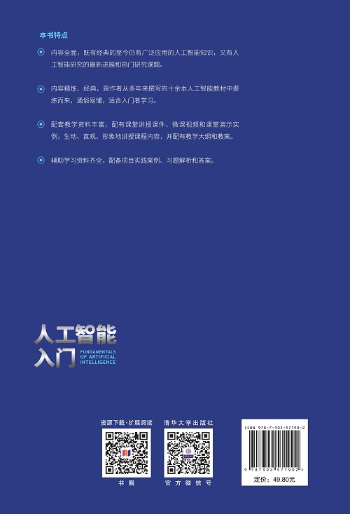 前言 当今,任何一个行业都会提到一个非常有时代感的名词——人工智能。人工智能迎来了第三次高潮,正受到前所未有的重视,教育部已经申请将人工智能上升为一级学科,军事领域将其视为未来战争胜利的决定因素之一。 人工智能涉及的学科面广,需要了解的知识很多,悬而未决的研究课题很多,存在争议性的问题也很多,而且人工智能的发展道路非常曲折,已经经过了两起两落,未来的发展道路也会很长。然而,我们又必须去了解和利用它; 不然我们就会落后于时代。作者作为人工智能的教学和研究工作者,在人工智能教学岗位上已坚守三十余年的教授,终归有所积累,此时应义不容辞地站出来,编写一本较为通俗的人工智能入门教材,作为那些渴望了解和掌握人工智能的人们的敲门砖。 本书是人工智能的入门教材,是作者在从事人工智能教学中撰写的十余本人工智能教材和习题解答及相关著作的基础上精炼和加工而成的,力图使其通俗化、形象化,并加入人工智能研究的最新进展和热门研究课题,如AlphaGo下棋的搜索原理、卷积神经网络、深度学习、大数据和云计算以及当前流行的人工智能开源工具等,全面地反映了国内外人工智能研究领域的最新进展和发展方向,并深入浅出地进行讲解,是了解人工智能基础知识的实用工具书。 全书共13章,基本覆盖传统的人工智能和最新人工智能进展的主要知识点,各章配有习题,并以不同形式配备习题解析和答案,课堂演示实例和微课视频,生动、直观、形象地讲授课程内容。 在本书的编写过程中,得到了清华大学出版社的大力支持,在此谨表示衷心感谢。 由于本书涉及的内容很广和作者水平所限,难以在人工智能的方方面面都有很深入的研究,书中内容难免有错...