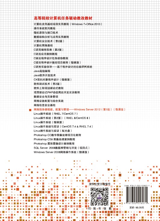 杨云,男,教授,Linux***精品课程负责人,Linux国家精品资源共享课程负责人,山东省教学名师,首届教育部行指委计算机委员会委员,教育部高等教育自学考试指定教材项目《互联网软件与应用》负责人。出版专著2部,主编教材20余部,其中6本获评“十二五”职业教育国家规划教材、7本获评“十三五”职业教育国家规划教材。主持的《“五核协同”的Linux操作系统教学资源建设》获省级教学成果二等奖。杨云教授是微软系统工程师(MCSE),多次负责全国的红帽Linux和微软Windows服务器的培训工作。 此书已出新版:网络服务器搭建、配置与管理——Windows Server 2016(第4版)(微课版) (点击即可查看详情)http://www.tup.tsinghua.edu.cn/booksCenter/book_09572501.html 订购教材后,可向作者(68433059@qq.com)或出版社索要课程标准、授课计划、电子教案、项目指导书、拓展提升、项目任务单、习题答案、试卷及本书和活动目录的所有视频资源。 网络服务器搭建、配置与管理——Windows Server 2019(微课版)(第5版) http://www.tup.tsinghua.edu.cn/booksCenter/book_10557101.html 出版日期:2024.05
