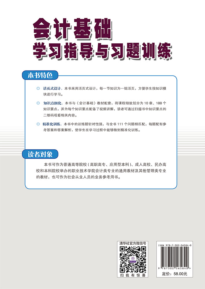 知识点细化。本书与〈会计基础〉教材配套,将课程细致划分为10章、188个知识要点,并为每个知识要点配备了视频讲解,读者可通过扫描书中知识要点的二维码观看相关内容。